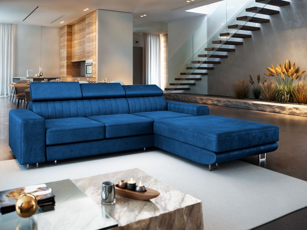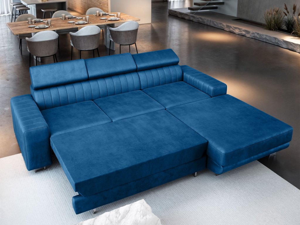 Pohovka je potiahnutá výnimočnou zamatovou látkou Monolith, ktorá spája vizuálnu eleganciu modrého zamatu s výnimočnými úžitkovými vlastnosťami. Látka je ošetrená hydrofóbnym povlakom, ktorý aktívne bráni prenikaniu tekutín do štruktúry vlákien, čím zaručuje mimoriadne jednoduchú a rýchlu údržbu. Keď potrebujete prenocovať hostí, vďaka jednoduchému podpornému mechanizmu je sedačka okamžite pripravená ako pohodlné lôžko s plochou 218x127 cm. Žiadne starosti s prikrývkami – objemný úložný priestor s automatickým mechanizmom otvárania je diskrétne ukrytý v rohovej predĺženej časti, čo prispieva k efektívnemu využívaniu priestoru a udržaniu poriadku.