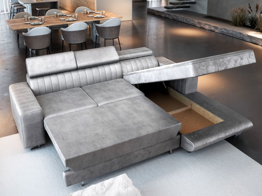 Rohová sedačka Noto je potiahnutá zamatovou látkou Monolith, ktorá vďaka svojej hydrofóbnej úprave predstavuje ideálnu voľbu pre rodiny. Táto povrchová úprava minimalizuje absorpciu tekutín, čím robí sivú sedačku odolnou voči bežným nehodám a výrazne uľahčuje jej čistenie. Funkčnosť sedačky je rozšírená o rýchlo rozložiteľné lôžko s plochou 218x127 cm, ktoré poslúži pre príležitostné spanie alebo ako trvalé riešenie. Nemenej dôležitý je aj priestranný úložný priestor s automatickým otváraním, ukrytý v rohu, ktorý poskytuje dostatok miesta na sezónne veci a pomáha udržať obývačku vždy upratanú.