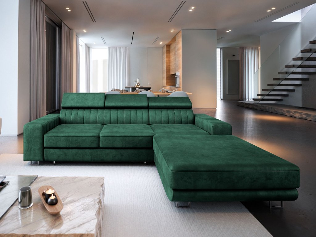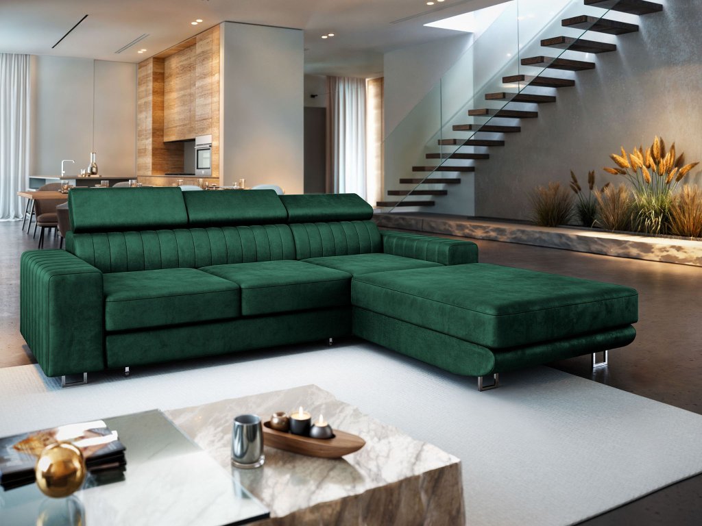 Predstavte si dokonalé útočisko po náročnom dni – to je rohová sedačka Noto v sýtej smaragdovo zelenej farbe. Tento nábytok stelesňuje modernú eleganciu a je navrhnutý pre maximálny rodinný komfort. Jej priestranné rozmery v kombinácii s atraktívnym prešívaním a vlnitou pružinou v sedadle zaručujú ergonomické sedenie a dlhotrvajúcu oporu. Kľúčový je individuálny prístup k relaxu, čo umožňujú tri opierky hlavy nastaviteľné v piatich polohách. Vďaka celočalúneniu sa jedná o voľne stojaci kus nábytku, ideálny na umiestnenie kdekoľvek v priestore – či už k stene, alebo ako vkusný deliaci prvok medzi obývačkou a jedálňou. Voliteľné prevedenie (ľavé/pravé) zabezpečuje, že sa Noto perfektne zladí s vaším interiérom.