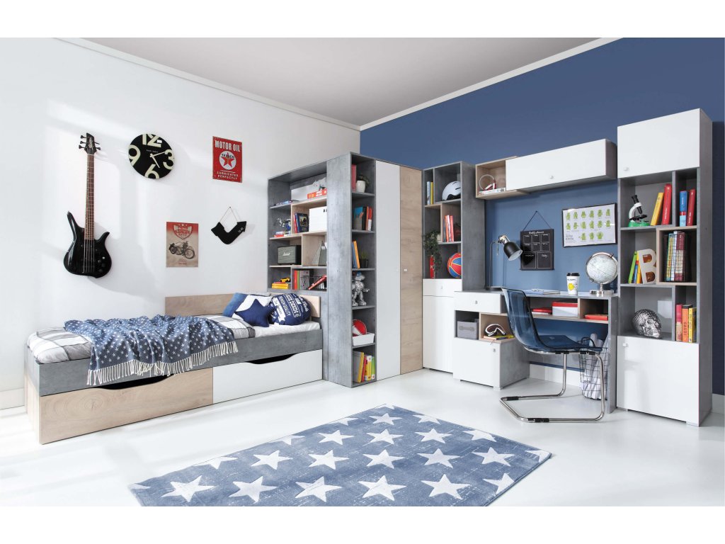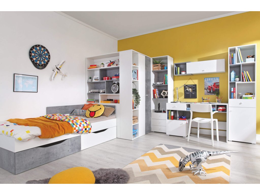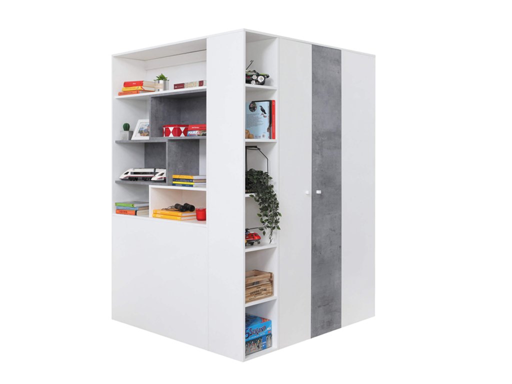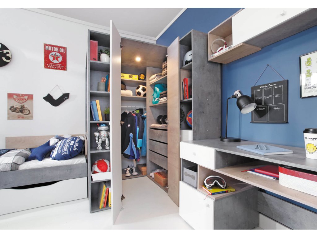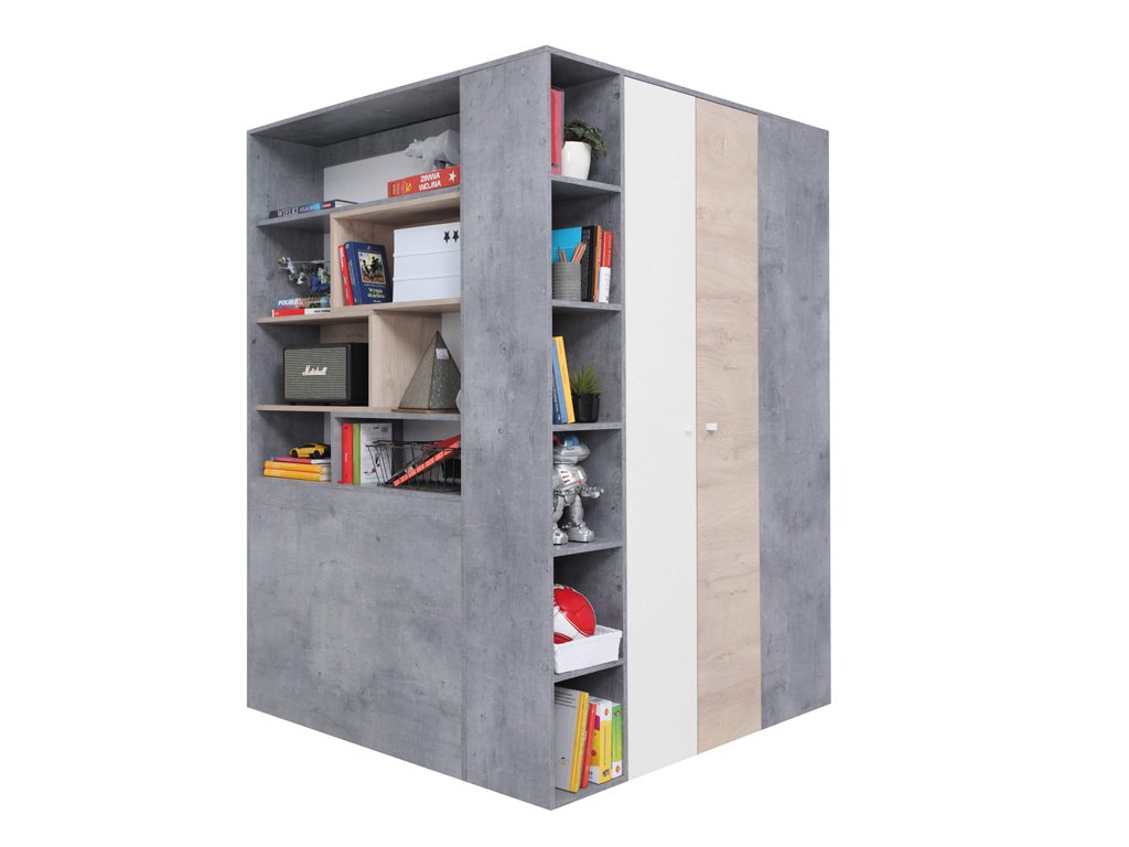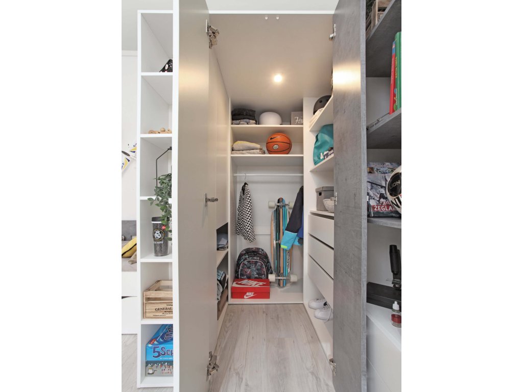 Ako môžete vidieť aj na vizualizáciách v galérii, sektorová šatníková skriňa skutočne odhalí svoj potenciál pri kombinácii s ďalším detským nábytkom modelového radu Fabio. V ponuke máme ďalšie rohové aj klasické skrine, regály, písací aj TV stolík, komody, detskú posteľ, ale aj celú nábytkovú stenu. Skriňa je k dispozícii v dvoch farebných kombináciách, v bielej v spojení s betónom alebo v bielej v spojení s drevom. Pri nákupe ďalších kúskov nábytku však môžete aj tieto dva dekory nakombinovať (podobne, ako pri detskej posteli Fabio) a vytvoriť tak skutočne originálnu a nenapodobiteľnú detskú alebo študentskú izbu.