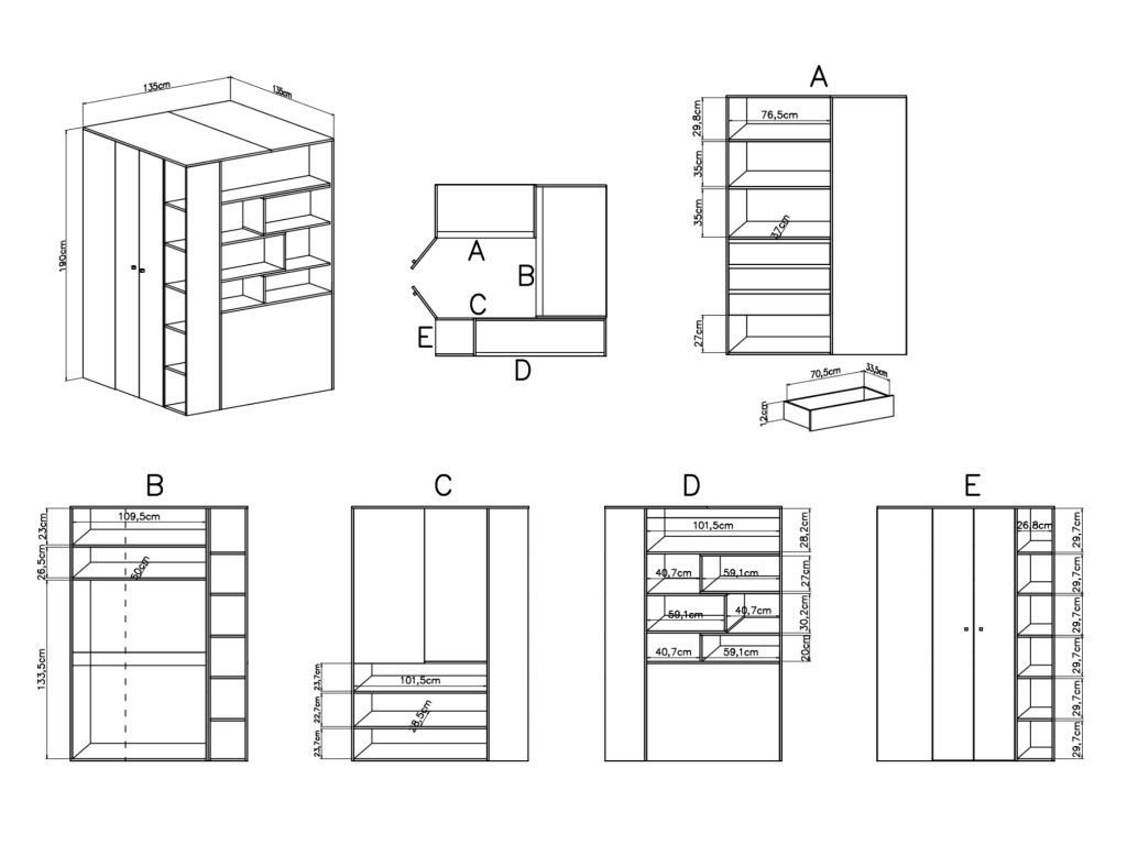 Šatník Fabio má veľa otvorených políc, ktoré sú umiestnené vonku aj vo vnútri skrine. Po otvorení dverí je možné vstúpiť do šatníka. Svetlo nie je súčasťou! Šatníková skriňa disponuje tyčou na zavesenie oblečenia, zásuvkami (3 ks) a policami (20 ks). Skriňa je univerzálna - je možné ju namontovať vpravo/vľavo.