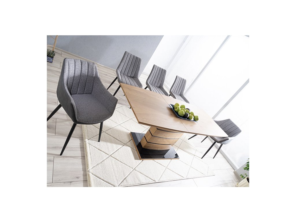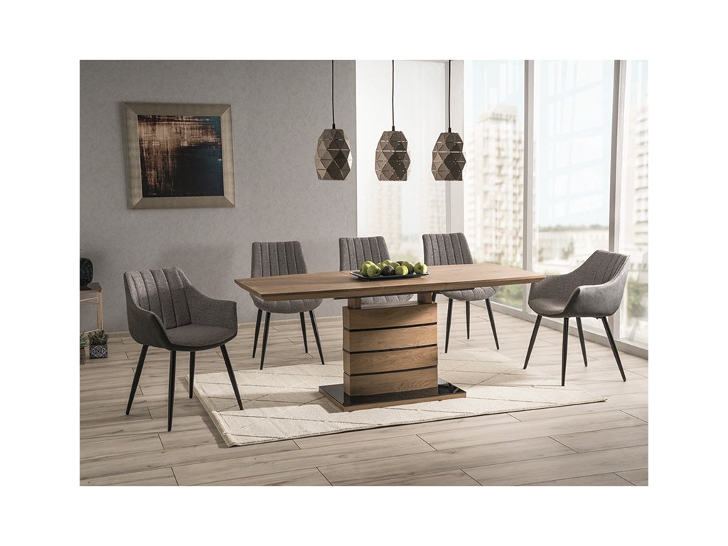 Jedálenský stôl Daro je rozkladací stôl vhodný do priestrannej jedálne či kuchyne. Už na prvý pohľad zaujme svojim originálnym dizajnom a vynikajúcou kvalitou spracovania. Je vyrobený z kvalitnej MDF dosky v odtieni tmavý dub. Na jeho výrobu boli použité komponenty odolné voči vlhkosti. Originálny podstavec a krásne farby urobia zo stola dokonalý doplnok do každej modernej miestnosti. Vrchnú dosku je možné predĺžiť až na dĺžku 180 cm.