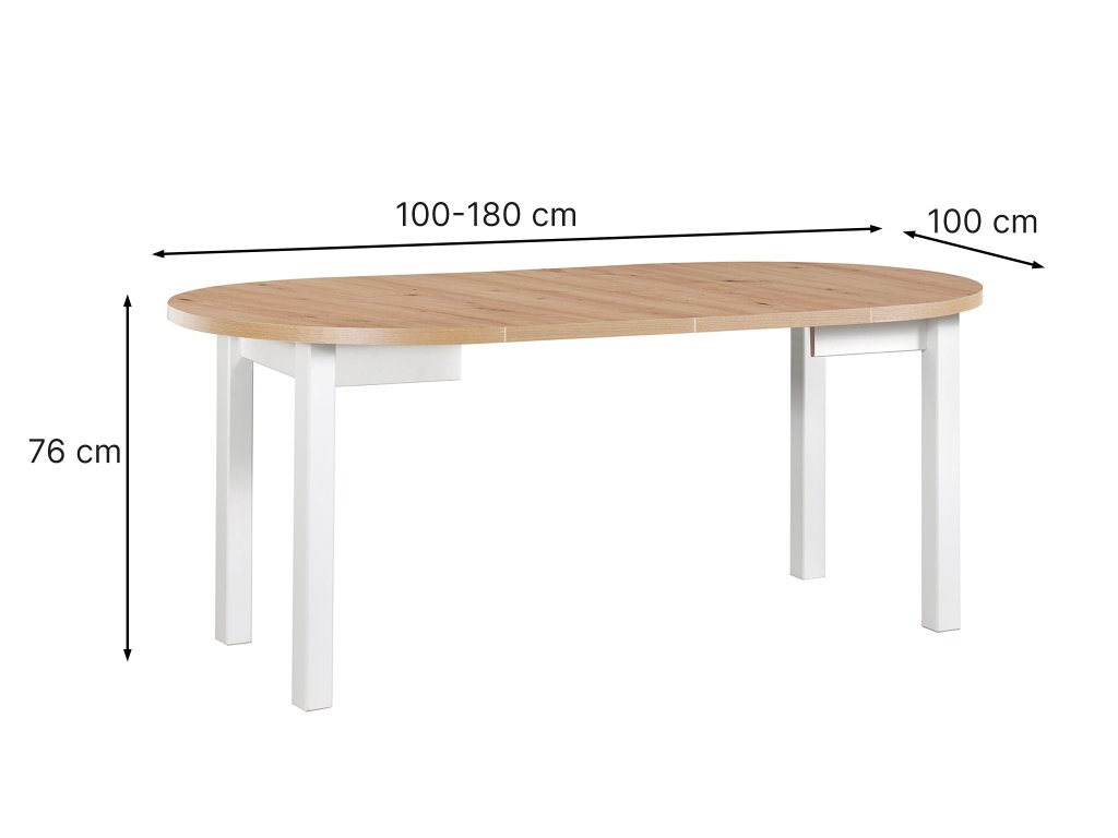 Okrúhly jedálenský stôl Poli 4 je ideálnou voľbou do provensálskej aj klasickej jedálne. S priemerom 100 cm sa hodí do rôznych veľkostí kuchýň, od menších po priestrannejšie. Jedálenský stôl vyniká možnosťou jednoduchého rozšírenia na 180 cm, čo z neho robí flexibilný a praktický kúsok nábytku. Jeho nadčasový dizajn sa ľahko skombinuje s rôznymi typmi jedálenských stoličiek, čím sa stáva skvelým doplnkom každej jedálne. Okrúhly stôl Poli 4 je vyrobený z kvalitných materiálov, ako je laminovaná doska a bukové nohy, ktoré zabezpečujú pevnosť a dlhú životnosť. Vrchná doska je vybavená ABS hranami, ktoré poskytujú vysokú odolnosť voči poškodeniu.