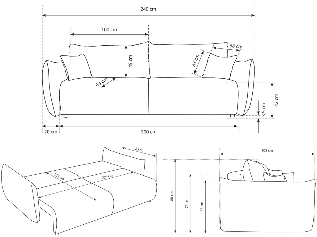 - Rozmer (šxvxh): 240 x 88 x 108 cm