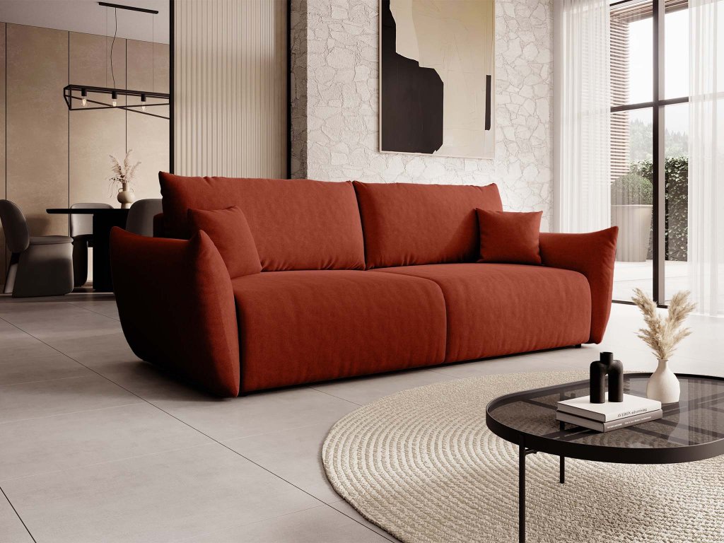 Rozkladacia pohovka Allora v tehlovom odtieni čalúnenia Melody 10 je ako stvorená pre tých, ktorí túžia po útulnom domove s charakterom. Jej hrejivá farba pripomína západ slnka za mestskými múrmi – prináša do priestoru emóciu, štýl a pocit bezpečia. Látka Melody 10 nie je len krásna na pohľad, ale aj šetrná k prírode a zdraviu – neobsahuje škodlivé látky, je jemná na dotyk a vhodná aj pre deti a alergikov. Allora spája funkčnosť s estetikou: ponúka pohodlné sedenie počas dňa, útulné lôžko na noc a šikovný úložný priestor – jednoducho láska na prvý pohľad v tehlovom prevedení.