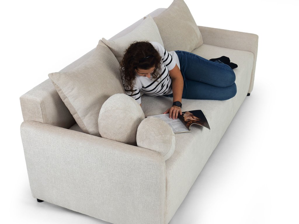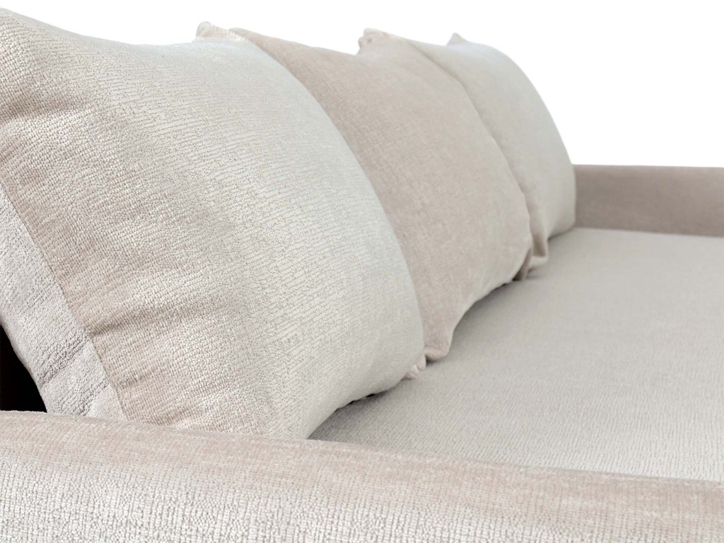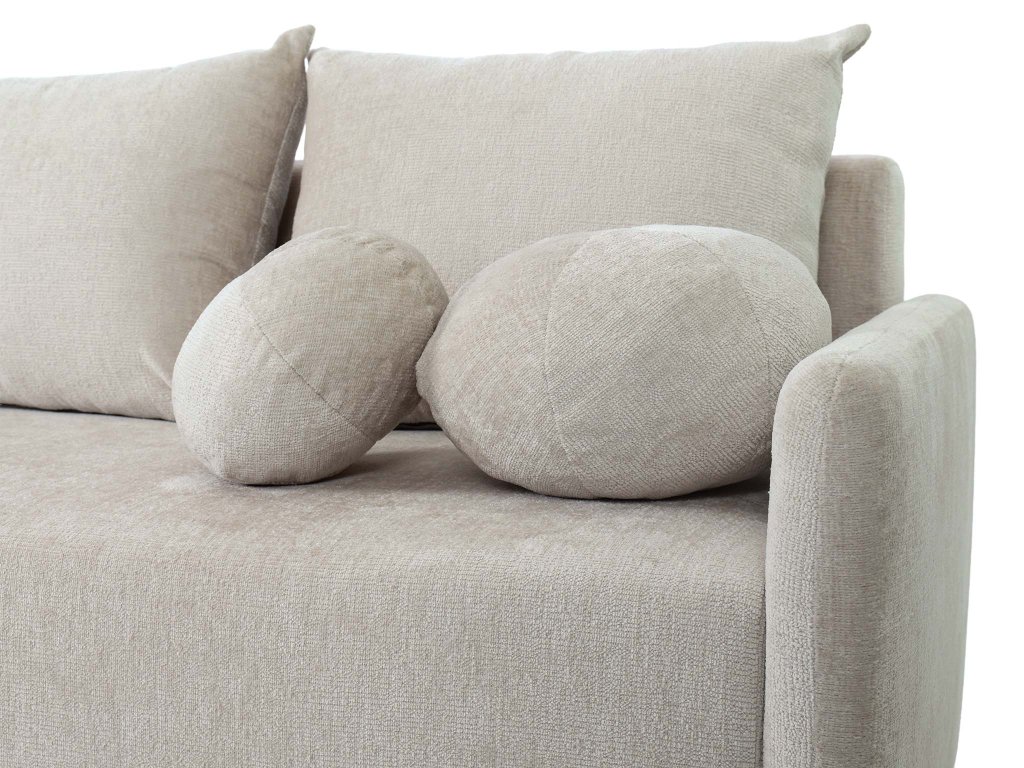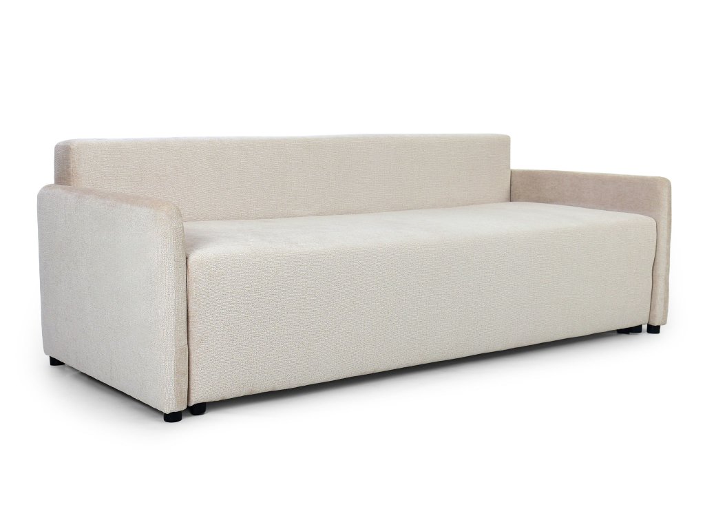 Rozkladacia sedačka Apulia má jednoduchý, elegantný a nadčasový tvar s rovnými líniami a nenápadnými, nízko posadenými podrúčkami. Jej neutrálne krémové čalúnenie a látka s jemnou, štruktúrovanou väzbou pôsobia útulne a luxusne. Dizajn je doplnený o tri voľné chrbtové vankúše, ktoré vizuálne zmäkčujú celkový dojem. Základ tvorí pevná konštrukcia z dreva a drevotriesky. Pre maximálne pohodlie je sedadlo aj operadlo vyplnené kombináciou Bonell pružín a peny T30, ktoré zabezpečujú strednú tvrdosť. Sedačka stojí na nenápadných, čiernych plastových nožičkách.