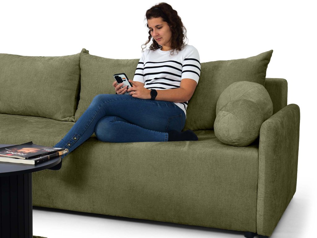 Trojmiestna rozkladacia sedačka do obývačky bola navrhnutá tak, aby maximálne zjednodušila váš život. Sedačka sa jednoducho a rýchlo transformuje na plnohodnotné lôžko vďaka automatickému mechanizmu, čím sa stáva perfektným riešením pre návštevy alebo každodenné spanie. Zároveň ponúka priestranný úložný priestor, kde pohodlne uskladníte všetku posteľnú bielizeň. Olivové čalúnenie v látke Perfect Harmony zaručuje, že si vďaka svojej vysokej odolnosti proti oderu a nenáročnej údržbe zachová trendový odtieň aj špičkový vzhľad po mnoho rokov používania.