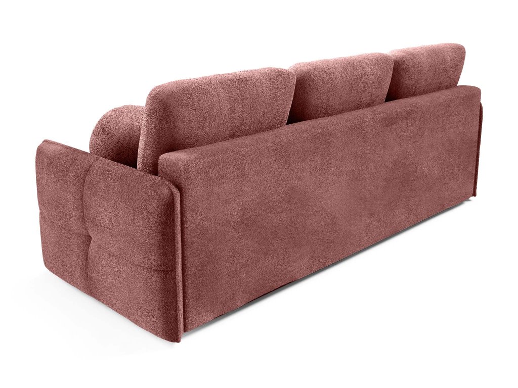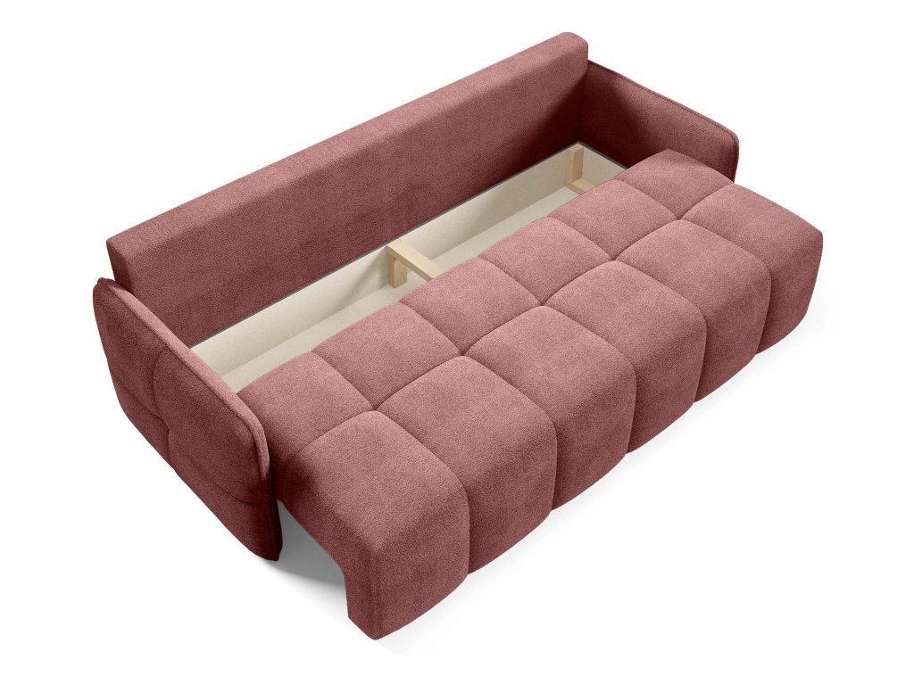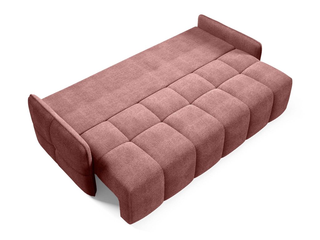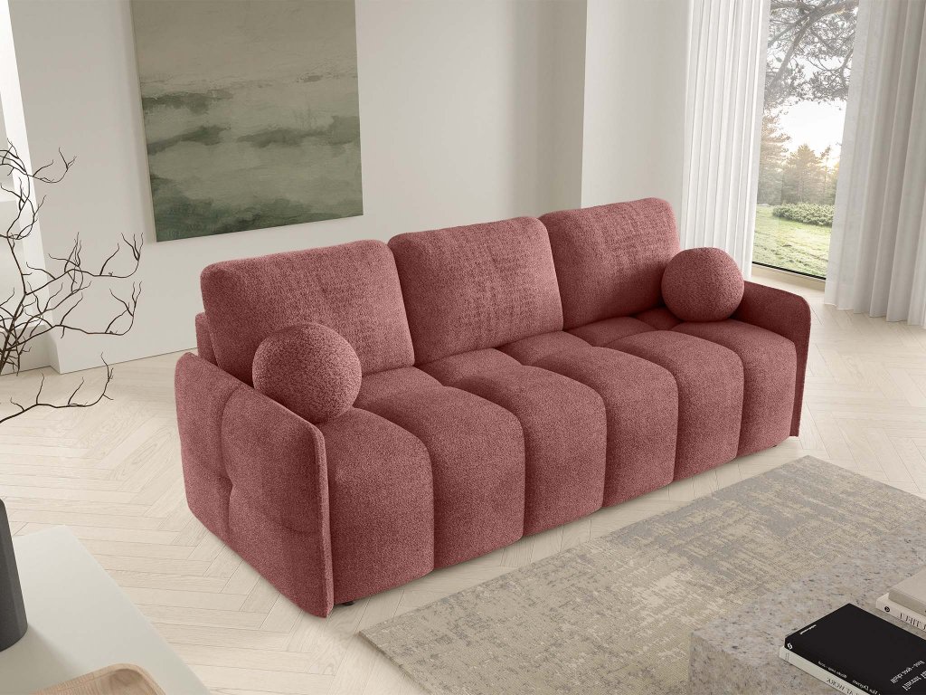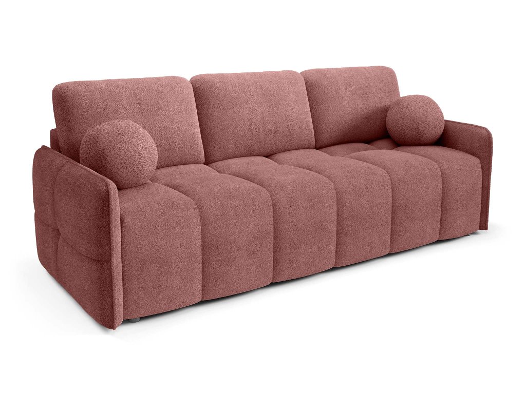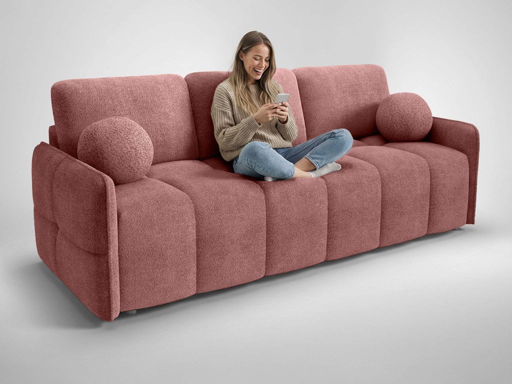 Tehlová pohovka Elia je vybavená rozkladacou funkciou, ktorá umožňuje rýchle a jednoduché premenenie na lôžko pre hostí alebo príležitostné spanie. Integrovaný úložný priestor poskytuje praktické miesto na prikrývky, posteľnú bielizeň či sezónne doplnky, čím prispieva k prehľadnému a upratanému priestoru. Celkový vzhľad pohovky dotvárajú odnímateľné dekoračné vankúše, vrátane dvoch vankúšov v tvare guľky, ktoré pohovke pridávajú osobitý charakter a štýl. Vďaka čalúnenej zadnej strane je Elia vhodná aj na voľné umiestnenie do priestoru, kde vynikne zo všetkých uhlov a stane sa prirodzeným stredobodom obývacej izby.