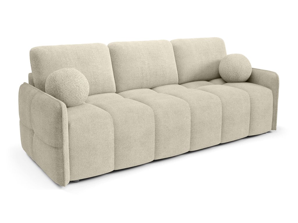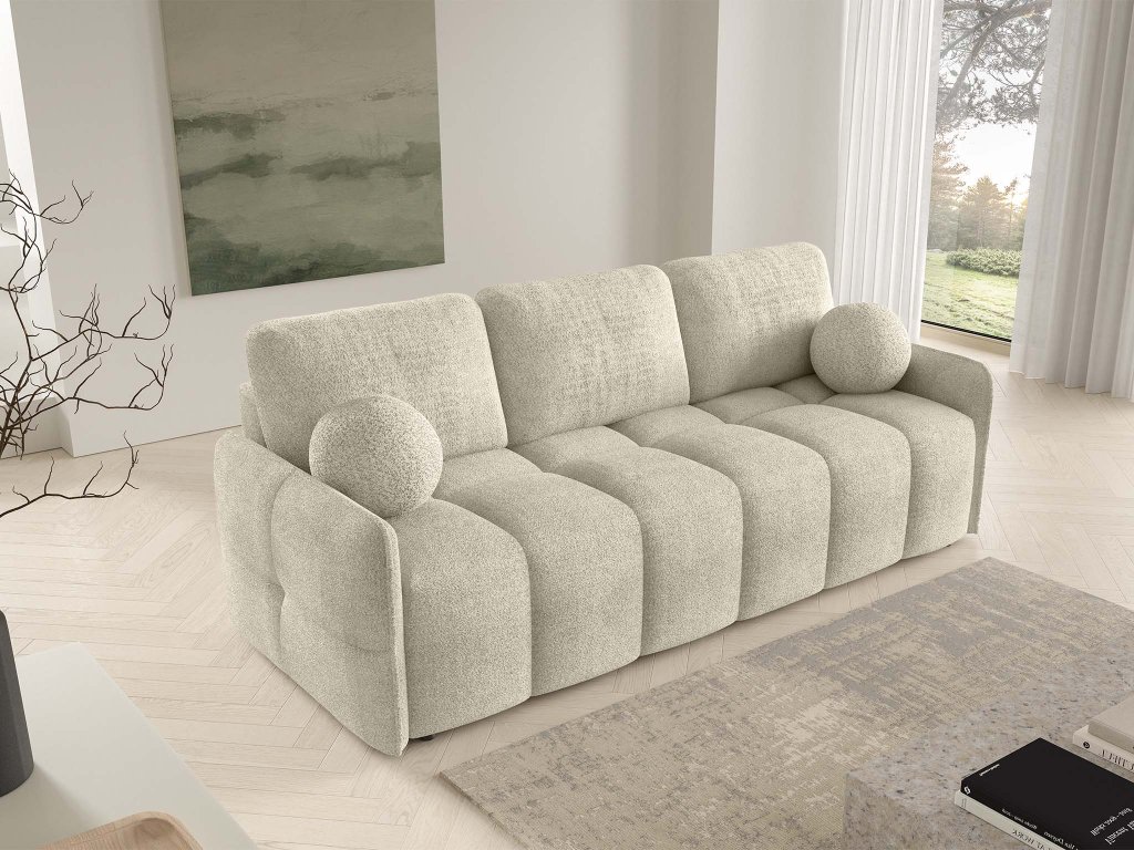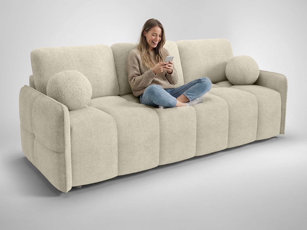 Táto moderná pohovka Elia ponúka praktickú rozkladaciu funkciu na príležitostné spanie a integrovaný úložný priestor, ideálny na uskladnenie posteľnej bielizne či sezónnych doplnkov. Súčasťou pohovky sú odnímateľné dekoračné vankúše, vrátane dvoch originálnych vankúšov v tvare guľky, ktoré dotvárajú celkový dizajn. Vďaka čalúnenej zadnej časti je pohovka vhodná aj na voľné umiestnenie do priestoru, nielen ku stene.