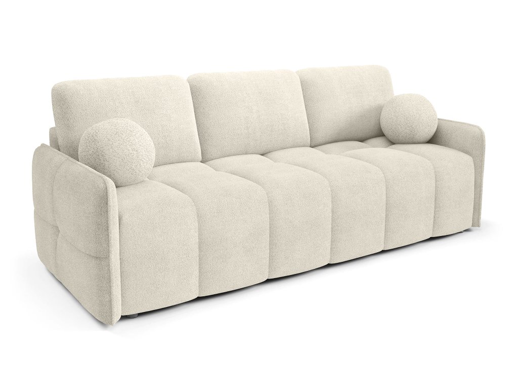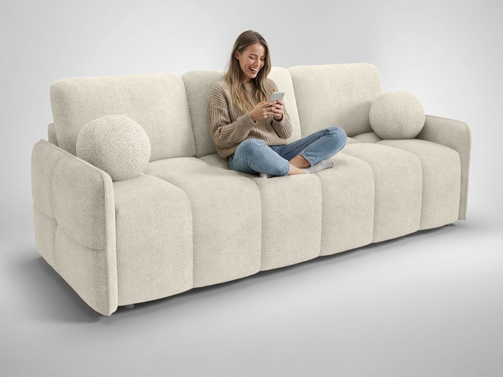 Pohovka Elia je vybavená rozkladacou funkciou, ktorá umožňuje jednoduchú premenu na lôžko pre príležitostné spanie. Súčasťou je aj praktický úložný priestor, ideálny na uloženie posteľnej bielizne, diek či sezónnych doplnkov, vďaka čomu pomáha udržiavať poriadok v interiéri. Komfort a vizuálnu stránku dopĺňajú odnímateľné dekoračné vankúše, vrátane dvoch štýlových vankúšov v tvare guľky, ktoré pohovke dodávajú osobitý charakter. Vďaka čalúnenej zadnej časti je Elia vhodná aj na umiestnenie do priestoru, kde vynikne z každého uhla, nielen pri stene.