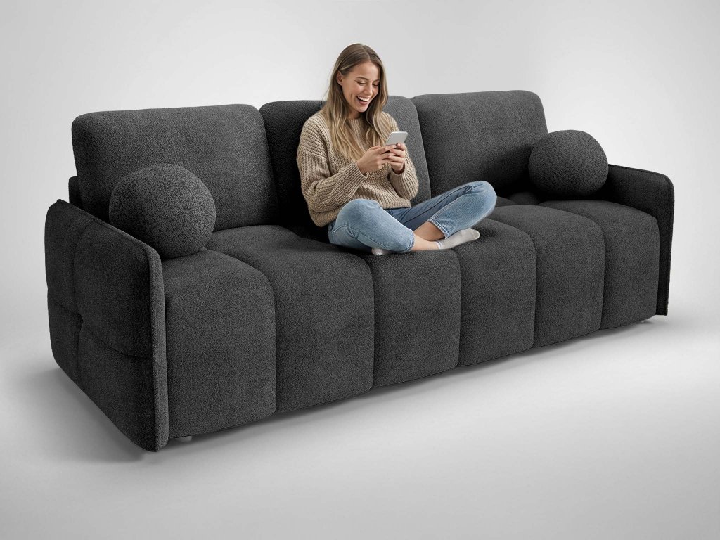 Pohovka Elia je vybavená rozkladacou funkciou, ktorá umožňuje rýchlu a jednoduchú premenou na pohodlné lôžko pre hostí alebo príležitostné spanie. Integrovaný úložný priestor poskytuje ideálne miesto na prikrývky, posteľnú bielizeň či sezónne doplnky, takže pomáha udržiavať poriadok a čistotu v obývačke. Estetickú hodnotu a komfort dopĺňajú odnímateľné dekoračné vankúše, vrátane dvoch originálnych vankúšov v tvare guľky, ktoré pohovke dodávajú osobitý a sofistikovaný vzhľad. Vďaka čalúnenej zadnej časti je Elia vhodná aj na voľné postavenie do priestoru, kde vynikne zo všetkých strán a pritiahne pozornosť.