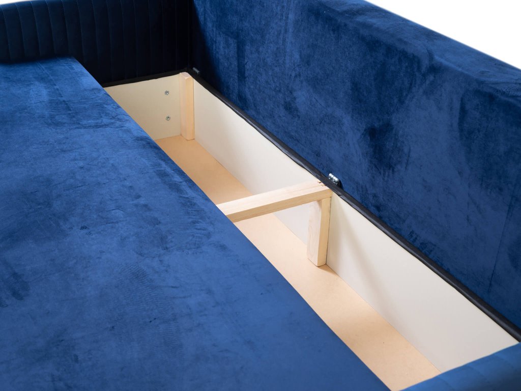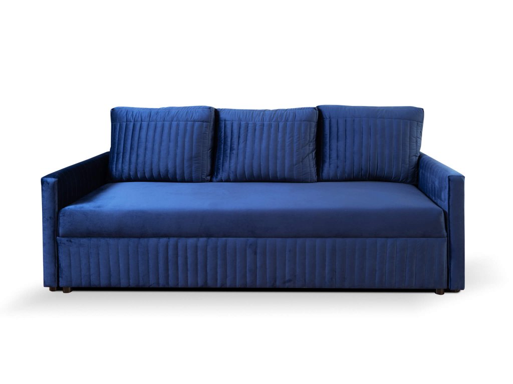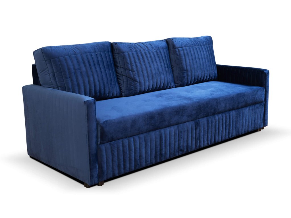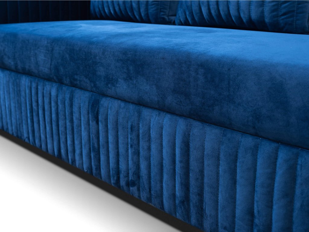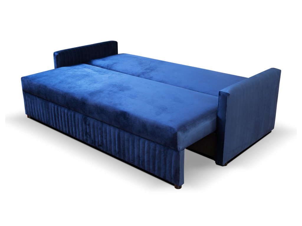 Predstavujeme jedinečnú rozkladaciu pohovku Erbella, ktorá je dizajnovým kúskom do každej obývačky. Rozkladací gauč je výborným praktickým riešením pre obývací priestor, hosťovskú izbu alebo pracovňu. Svojou jednoduchosťou a elegantným vzhľadom sa bude hodiť k akémukoľvek modernému i klasickému interiéru. Modrá pohovka ponúka tri pohodlné miesta na sedenie. Pohovka disponuje úložným priestorom, kde si môžete uložiť posteľnú bielizeň alebo sezónne oblečenie, čím ušetríte miesto v skrini. Sedacia časť pohovky spolu s opierkou chrbta sú vyrobné z pružiny typu bonell. Hlavnou výhodou pohovky je funkcia rozloženia. Rozkladanie je veľmi jednoduché a vďaka nemu získate plnohodnotné lôžko pre občasných hostí či prázdninárov. Rozkladacia pohovka je čalúnená modernou modrou látkou velur royal 22. Operadlo pohovky je vyplnené penou T25, zatiaľ čo sedadlo obsahuje penu T30. Modrý gauč má tri vankúše, ktoré zvyšujú pohodlie pri sedení. Sú čalúnené rovnakou látkou ako gauč a majú dekoračné vertikálne prešívanie. Pohovka ponúka komfortné sedenie aj ležanie. Užite si chvíle s rodinou a priateľmi na pohodlnom gauči.