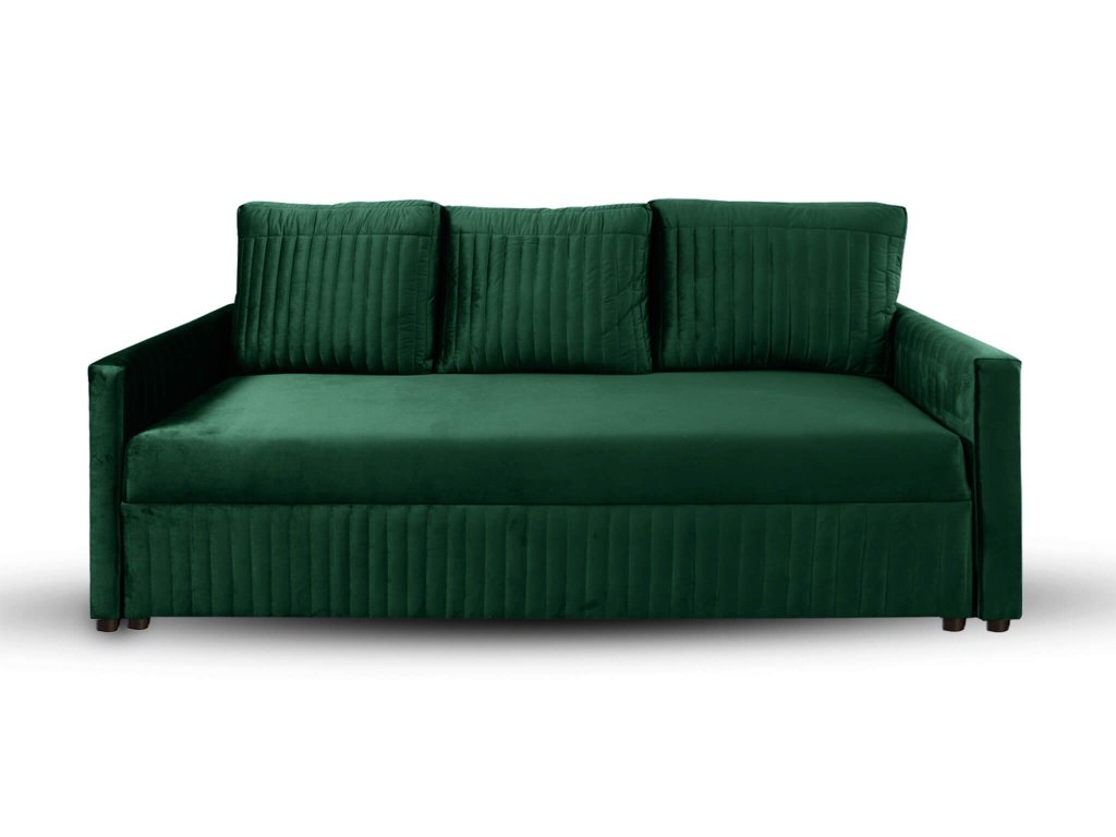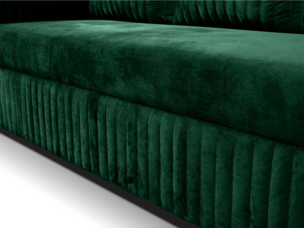 Dodajte vašej obývačke jedinečný dizajn vďaka rozkladacej pohovke Erbella. Dizajnový a praktický kúsok vhodný do obývačky, hosťovskej ale aj študentskej izby. Moderný no zároveň jednoduchý vzhľad sa bude hodiť k akémukoľvek modernému i klasickému interiéru. Zelená pohovka ponúka tri pohodlné miesta na sedenie. Rozkladací gauč disponuje úložným priestorom, kde si môžete uložiť posteľnú bielizeň alebo sezónne oblečenie, čím ušetríte miesto v skrini. Sedacia časť pohovky spolu s opierkou chrbta sú vyrobné z pružiny typu bonell. Hlavnou výhodou pohovky je funkcia rozloženia. Rozkladanie je veľmi jednoduché a vďaka nemu získate plnohodnotné lôžko pre hostí. Čalúnená je modernou zelenou látkou velur royal 25. Velúrová látka je jemná, hebká a príjemná na dotyk. Operadlo pohovky obsahuje penu T25 a sedadlo je vyplnené penou T30. Zelený gauč má tri vankúše, ktoré zvyšujú pohodlie pri sedení. Sú čalúnené rovnakou látkou ako gauč. Vankúše a spodná časť pohovky má dekoračné vertikálne prešívanie. Pohovka ponúka komfortné sedenie aj ležanie. Užite si chvíle s rodinou a priateľmi na pohodlnom gauči.