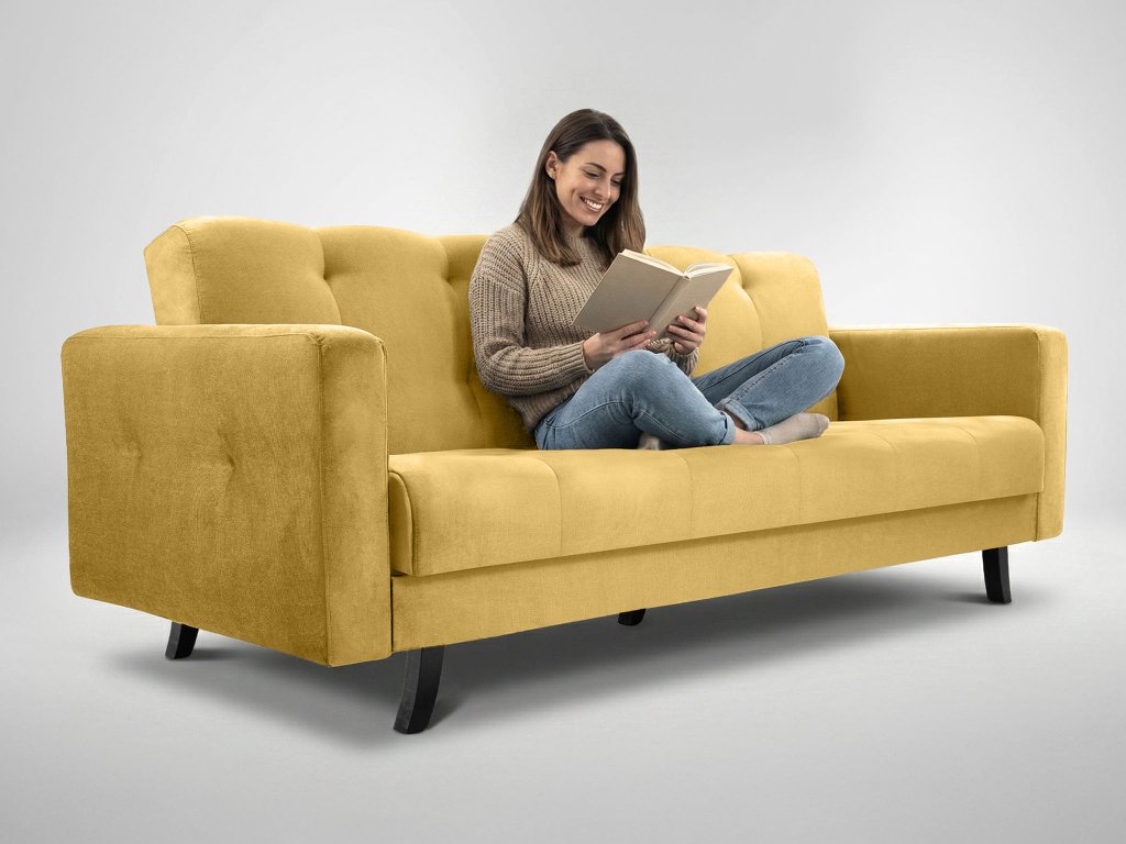 Vďaka funkcii rozkladania ľahko premeníte pohovku na lôžko pre hostí či príležitostné spanie. Navyše, praktický úložný priestor pod sedadlom ponúka miesto na posteľnú bielizeň a iné doplnky. Vysoké čierne drevené nožičky dodávajú stabilitu a uľahčujú upratovanie pod sedačkou. Pružiny a pena v pohovke Lisabon zaisťujú pohodlné sedenie a spanie. Vďaka mechanizmu klik-klak sa pohovka ľahko a rýchlo rozloží na lôžko. Ak túžite po odvážnej elegantnej pohovke, Lisabon v žltej farbe je tou správnou voľbou. Rozkladacia pohovka Lisabon je čalúnená kvalitnou velúrovou látkou Kronos 43. Je vyrobená zo 100 % polyesteru a radí sa medzi velúrové textílie. Tkaná poťahová látka je veľmi mäkká a príjemná na dotyk. Je odolná voči svetlu, vyblednutiu a nežmoluje sa.