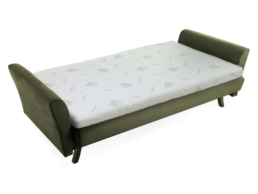 Doprajte si dotyk luxusu s rozkladacou pohovkou Orchy v olivovej farbe. Táto pohovka je ideálna pre tých, ktorí hľadajú a štýlové riešenia pre svoj interiér. Zamatová látka Kronos s jemným leskom je príjemná na dotyk a odolná voči oderu. Ozdobné prešívanie na operadle a čierne drevené nohy dodávajú pohovke moderný a elegantný vzhľad. Pohovka Orchy ponúka plochu na spanie 118x195 cm a praktický úložný priestor na lôžkoviny. Vďaka mechanizmu KLIK-KLAK je rozkladanie pohovky jednoduché a rýchle.