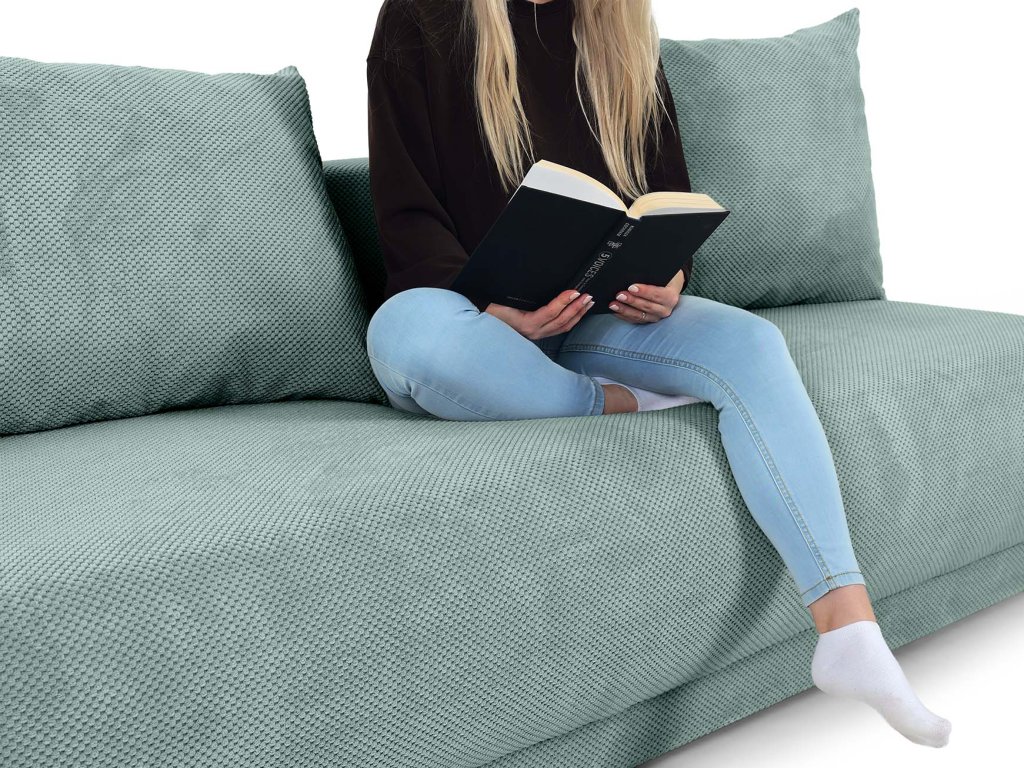 Táto pohovka Ander je navrhnutá pre tých, ktorí hľadajú viacúčelový kus nábytku bez kompromisov v štýle. Pomocou jednoduchého mechanizmu ju v okamihu premeníte na priestranné lôžko – ideálne na spánok hostí či každodenné používanie. Vnútri sa ukrýva úložný priestor, do ktorého pohodlne uložíte posteľnú bielizeň, prikrývky alebo vankúše. Súčasťou balenia sú aj štyri dekoračné vankúše – dva väčšie a dva menšie – ktoré dotvárajú jej elegantný vzhľad a zvyšujú komfort pri sedení. Mentolová farba dodáva priestoru sviežosť a pokoj, čím sa pohovka stáva originálnym doplnkom každej miestnosti.