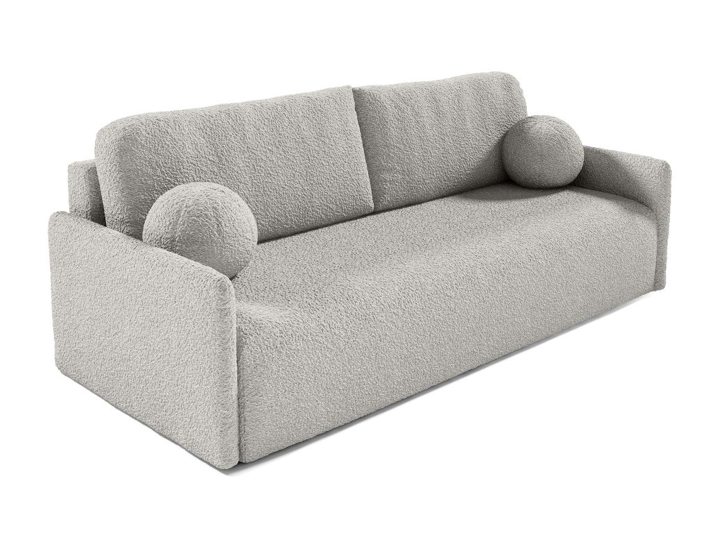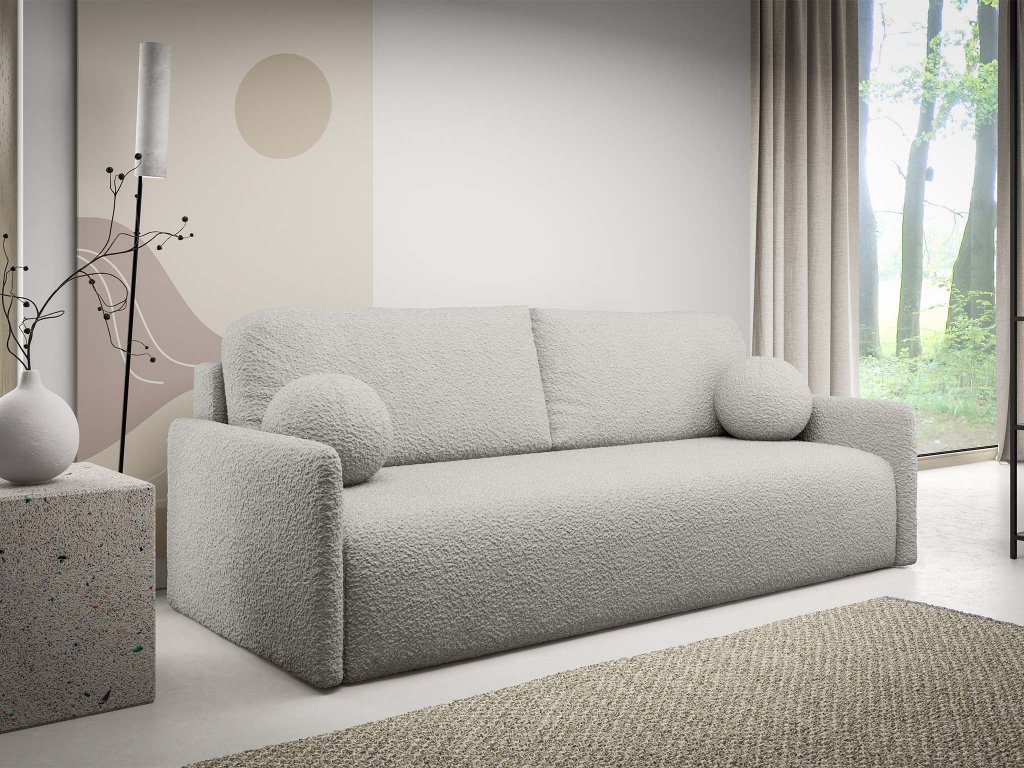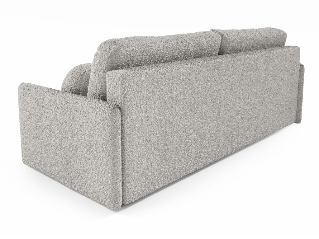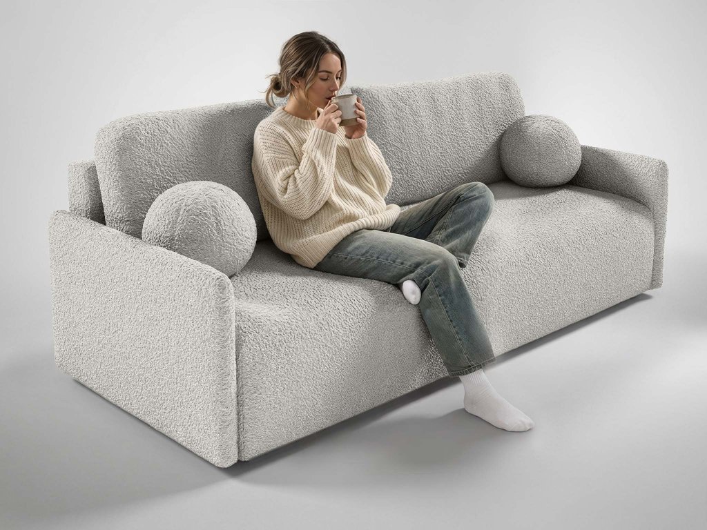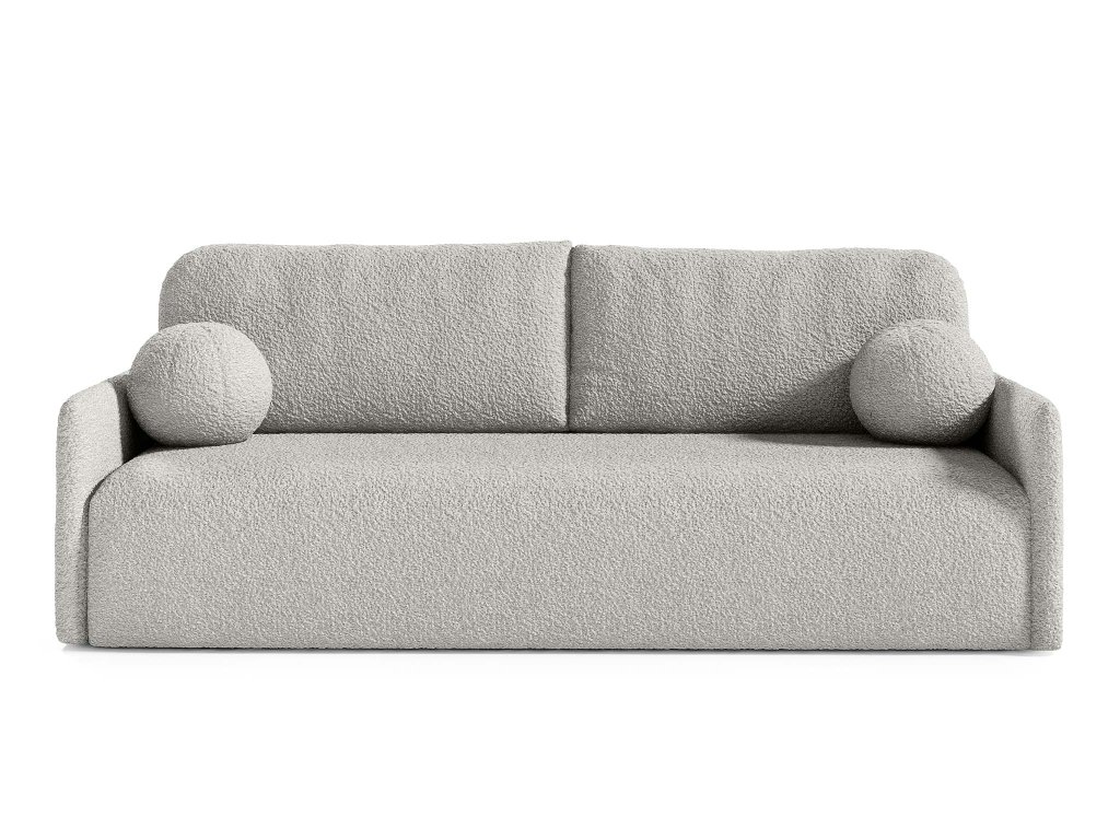Čalúnenie z látky Abriamo má jemný povrch so štruktúrou inšpirovanou bouclé priadzou. Materiál je mäkký na dotyk a zároveň odolný voči opotrebovaniu, žmolkovaniu, treniu aj svetlu. Pohovka je vybavená odnímateľnými vankúšmi operadla a okrúhlymi dekoračnými vankúšmi so zipsami, ktoré umožňujú jednoduchú údržbu a úpravu vzhľadu. Praktickým doplnkom je aj úložný priestor, ideálny na uskladnenie posteľnej bielizne alebo domácich doplnkov.
