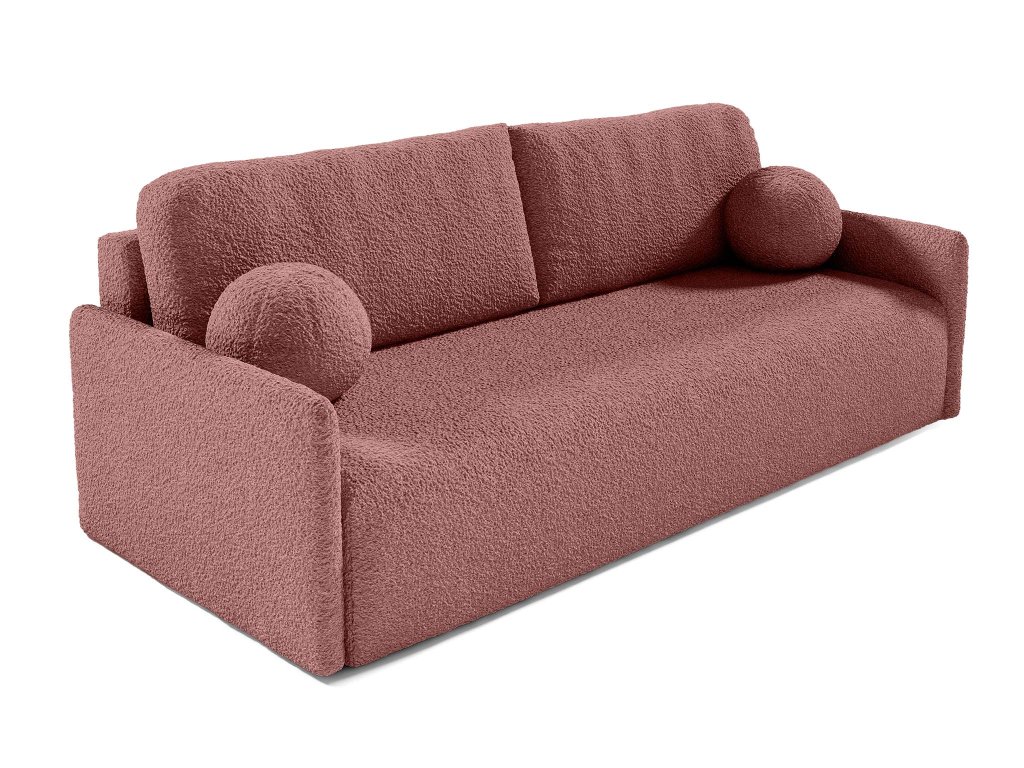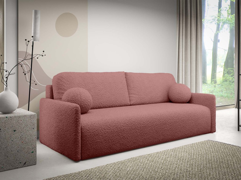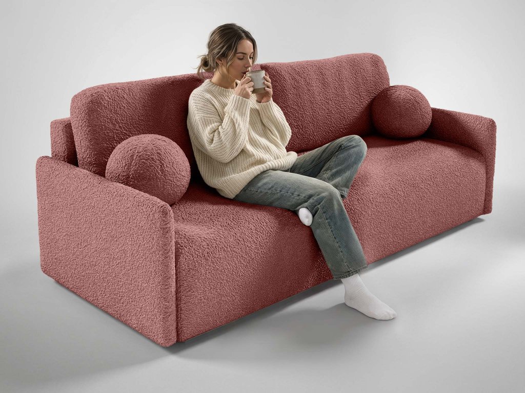 Čalúnenie z látky Abriamo má jemnú štruktúru pripomínajúcu bouclé priadzu a je príjemné na dotyk. Zároveň vyniká odolnosťou voči oderu, treniu, žmolkovaniu aj pôsobeniu svetla. Pohovka je vybavená odnímateľnými vankúšmi operadla a okrúhlymi dekoračnými vankúšmi so zipsami, ktoré uľahčujú údržbu aj zmenu vzhľadu. Praktický úložný priestor ponúka miesto na posteľnú bielizeň alebo drobnosti, ktoré chcete mať vždy poruke.