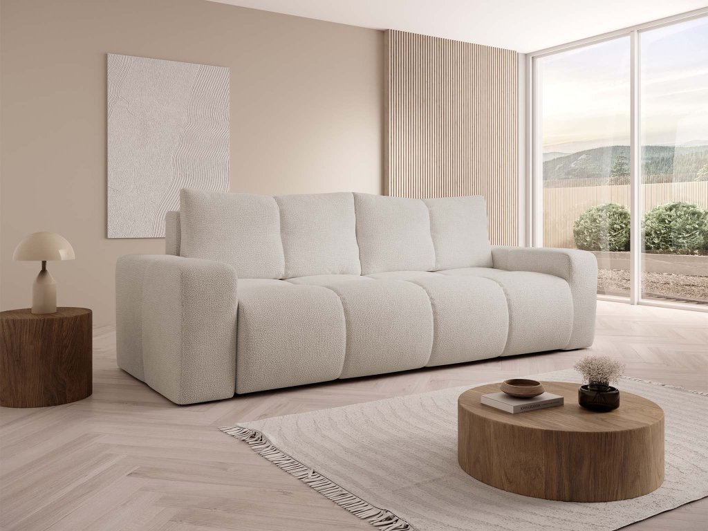 Rozkladacia pohovka Soho v béžovej farbe predstavuje dokonalé spojenie praktickosti a moderného štýlu. Vďaka výrazným bočniciam a jemnému prešívaniu pôsobí elegantne a zároveň útulne. Mäkké operné vankúše spolu s pohodlným sedákom zaručujú maximálny komfort. Poťah z látky Curio 09 je príjemný na dotyk, odolný a ľahko udržiavateľný. Pomocou DL mechanizmu pohovku jednoducho premeníte na lôžko, ideálne na príležitostné prespanie alebo večerný relax. Soho je štýlovým riešením do každej modernej domácnosti. Integrovaný úložný priestor pod sedadlom prakticky uschová posteľnú bielizeň alebo sezónne doplnky. Pohovka Soho má čalúnený zadný panel, vďaka čomu ju môžete umiestniť voľne do priestoru, nielen k stene. Voľné vankúše ponúkajú možnosť prispôsobiť si oporu chrbta podľa potreby. Tento model v sebe spája funkčnosť, štýl a komfort – výnimočný kúsok do každej modernej domácnosti. V kombinácií s taburetkou a kobercom vytvoríte dokonalý priestor.