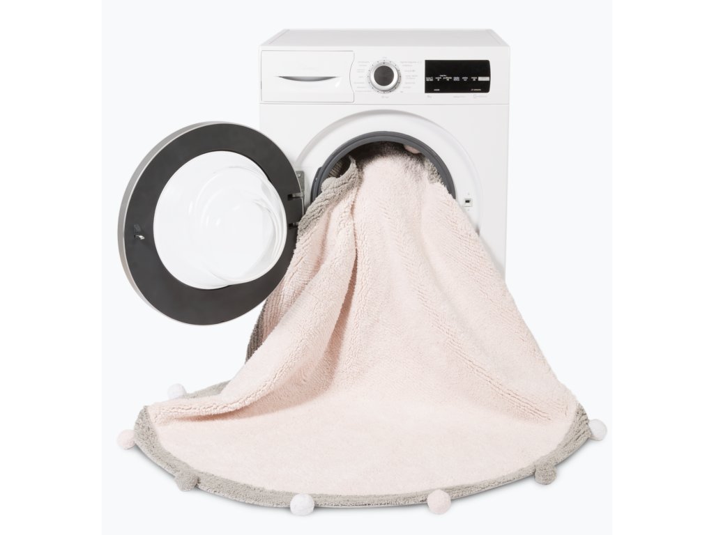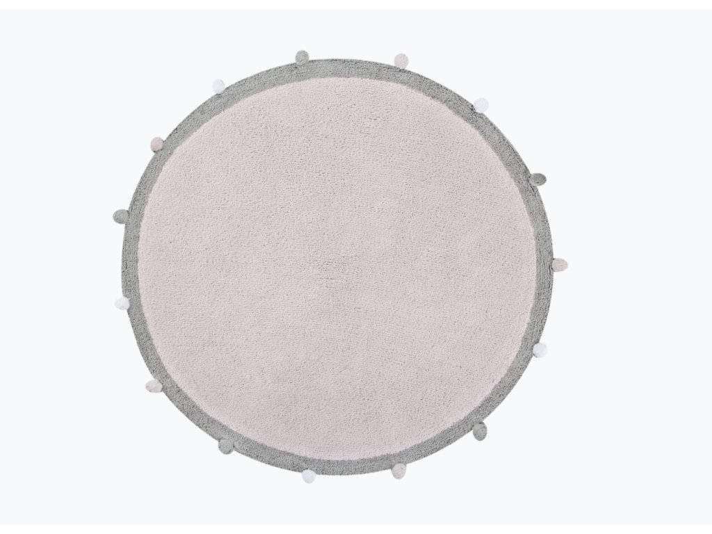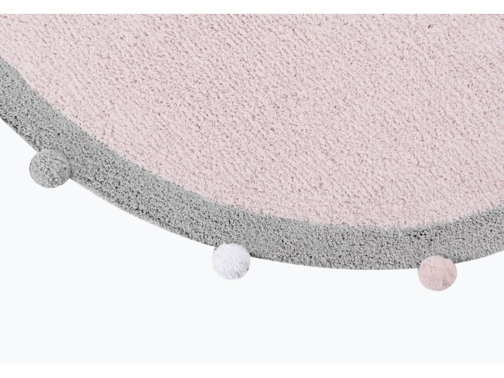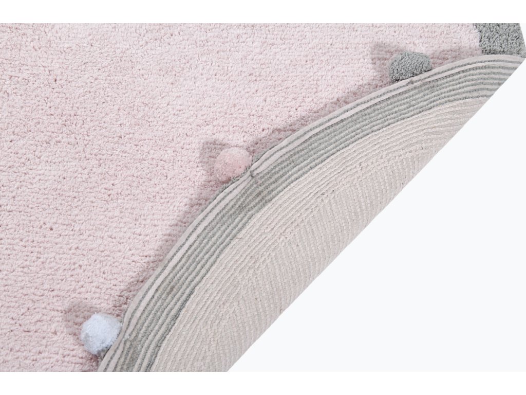 Detský koberec BUBBLY 120x120 cm ružový je okrúhly koberec so sivým okrajom a brmboľcami, vyrobený zo 100% bavlny. Koberec vyzerá skvele v dievčenských izbách, vďaka jemnej a elegantnej kombinácii pastelových farieb. Ručne vyrobený koberec je pre deti bezpečný, pretože sa používajú iba prírodné farbivá. Má niekoľko certifikátov ISO 9001, ISO 14001 a ISO 18001, ako aj certifikáty AITEX, ktoré zaručujú kvalitu spracovania pre zdravie a bezpečnosť používateľa. Vďaka použitiu bavlny je koberec mäkký, ľahký a pružný, ideálny do detskej izby.