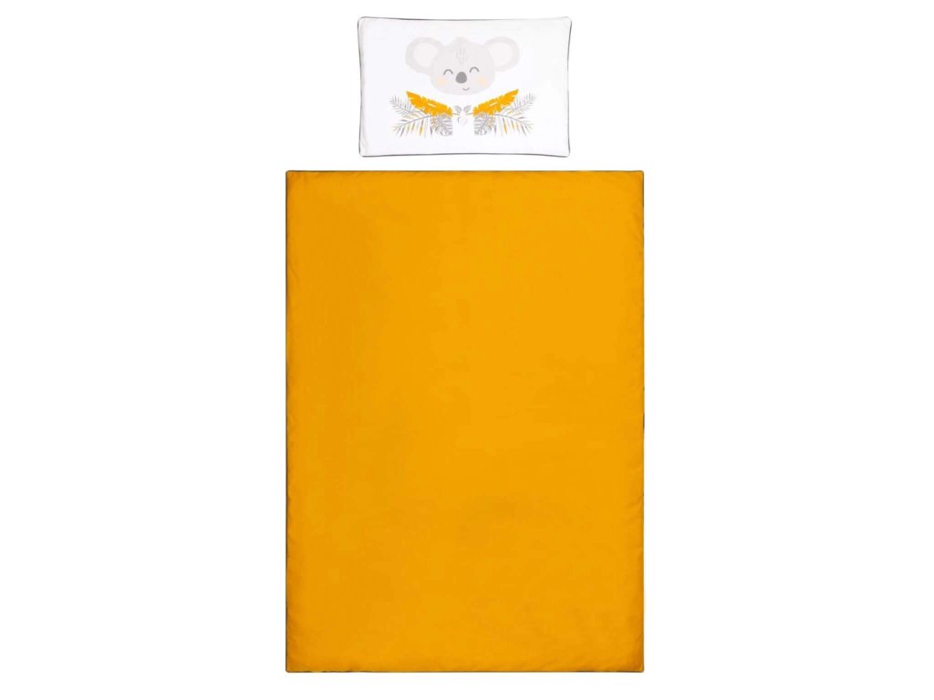 Doprajte svojím deťom príjemný a pokojný spánok s kvalitnými detskými obliečkami Albero Mio. Vankúš je obojstranný z jednej strany krásnej horčicovo žltej farby a z druhej strany má potlač rozkošnej koaly. Obliečka na perinku je celá v horčicovo žltom prevedení. Krásne farby rozžiaria celú detskú izbičku a zútulnia ju. Vaše deti budú tieto obliečky milovať. Vyrobené sú zo 100 % bavlny, ktorá je príjemná na dotyk a bezpečná pre detskú pokožku.