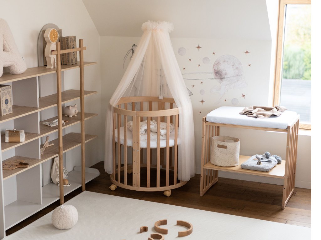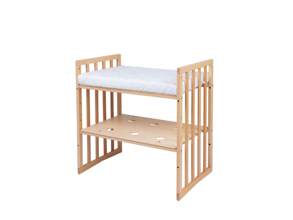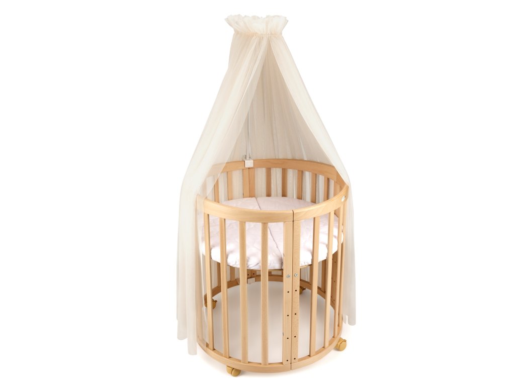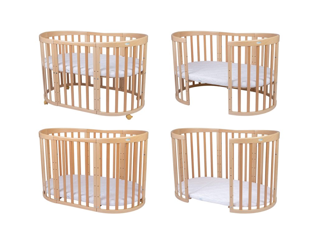 Rastúca postieľka 7v1 - tento multifunkčný kúsok sa prispôsobí potrebám vášho dieťaťa v každom veku. Môžete ho využiť ako prístelku pre novorodenca, oválnu postieľku, ohrádku alebo detský nábytok – kresielka so stolíkom. Vyrobená z bukového dreva s ekologickým náterom, bezpečným pre deti, a nastaviteľným roštom v 5 polohách (7–49 cm, s kolieskami až 55 cm). Sada obsahuje prateľný trojdielny matrac z peny T25 s bavlneným poťahom.