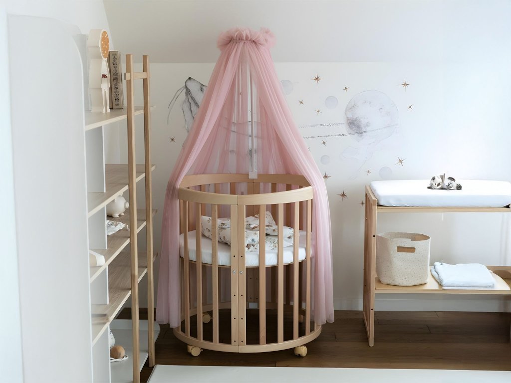 Prírodná rastúca postieľka 7v1 v sade s kvalitným tylovým baldachýnom v odtieni Rose za výhodnú cenu. Sada zahŕňa praktické kolieska, trojdielny matrac vhodný pre všetky varianty postieľky, elegantný baldachýn a stojan na jeho upevnenie. Kompletné riešenie pre vaše dieťa za atraktívnu cenu!
