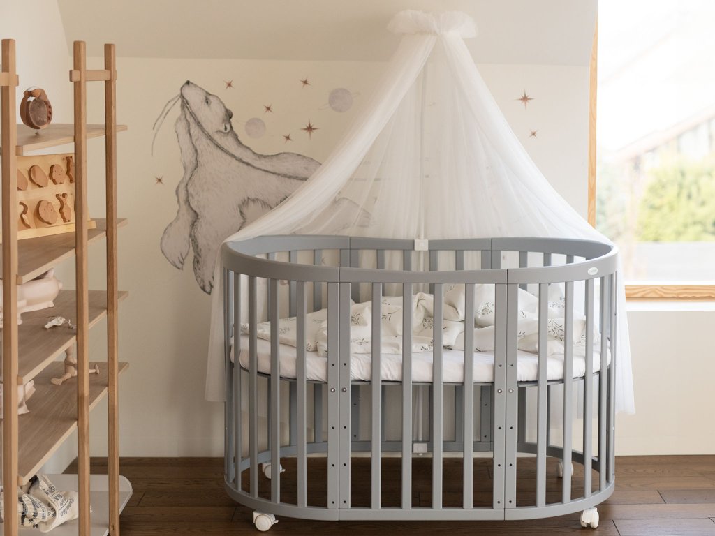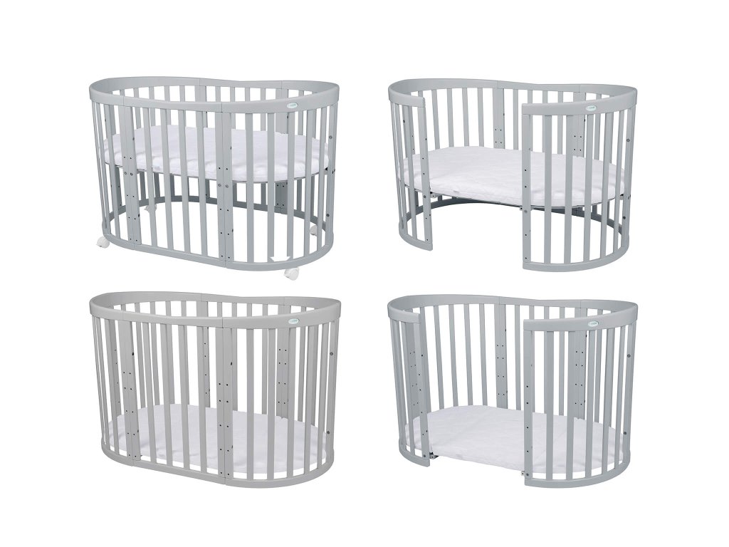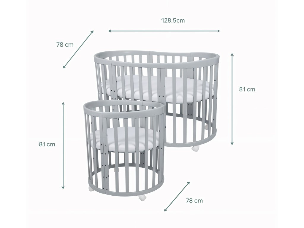 Detská postieľka 7v1 v sivom prevedení, ktorá rastie spolu s vaším dieťaťom a prispôsobí sa jeho potrebám. Môžete ju využiť ako prístelku pre novorodenca, oválnu postieľku, ohrádku alebo ako praktický detský nábytok – kresielka so stolíkom. Vyrobená z kvalitného bukového dreva s ekologickým a bezpečným náterom pre deti. Rošt je nastaviteľný do 5 výškových polôh (7–49 cm, s kolieskami 55 cm). Súčasťou balenia je prateľný trojdielny matrac z peny T25 s bavlneným poťahom.