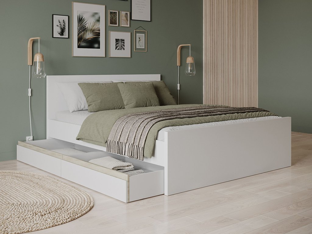 Dva úložné boxy pod posteľ Clyde sú ideálnym doplnkom do vašej spálne. Boxy sú vyrobené z kvalitnej laminátovej dosky a majú moderné prevedenie v bielej farbe s dekorom svetlého dubu, vďaka čomu sa skvele hodia k posteliam z kolekcie Clyde a perfektne zapadnú do vášho interiéru. Boxy sú dostupné v rozmeroch vhodných pre postele 140x190/200 cm a 160x200 cm. Sú praktickým riešením na uskladnenie posteľnej bielizne, sezónneho oblečenia alebo iných vecí, ktoré potrebujete mať vždy po ruke, no zároveň uložené mimo dohľadu. S boxami sa ľahko manipuluje a ich využitie oceníte najmä v menších bytoch, kde je každý úložný priestor vzácny.