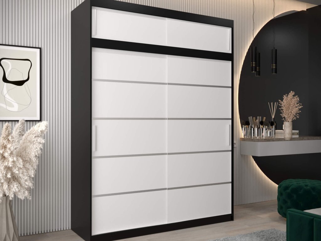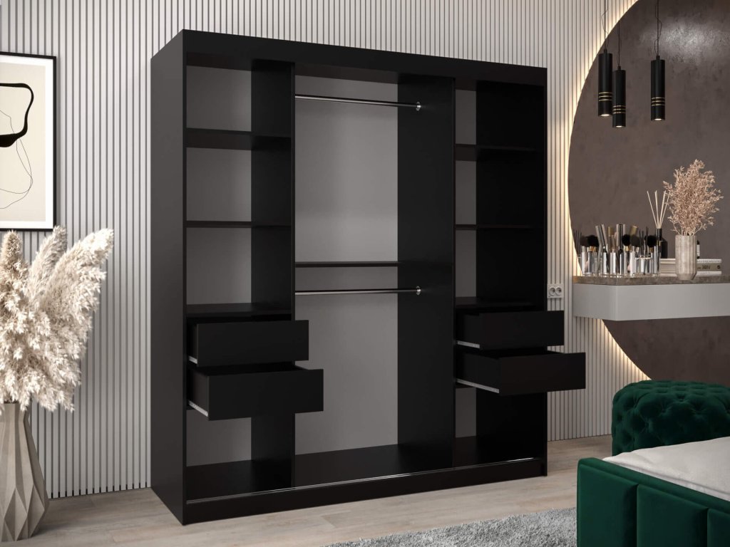 Čierno-biela šatníková skriňa Alyxia 180/200 Vám ponúkne dostatok úložného priestoru na Vaše oblečenie. Skriňa je vyrobená z vysoko kvalitnej laminovanej dosky (DTD) o hrúbke 16 mm, ktorá je odolná voči poškriabaniu, vlhkosti a vysokej teplote. Hrany skrine sú upravené kvalitnou PVC dyhou. Použitý je posúvný systém ,,BIMAK“ a hliníkové vodidlá, ktoré Vám zaručia pohodlné otváranie a zatváranie dverí. Vnútro skrine je rozčlenené na tri časti. Po stranách je tvorená štyrmi policami, ktoré vytvoria päť praktických úložných priestorov a v strede sa nachádza jedna polička a dve vešiakové tyče. Moderná skriňa vhodná do spálne, chodby či predsiene.