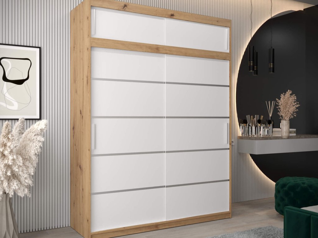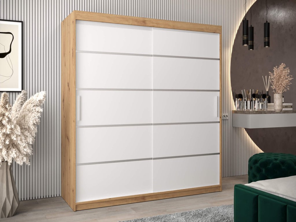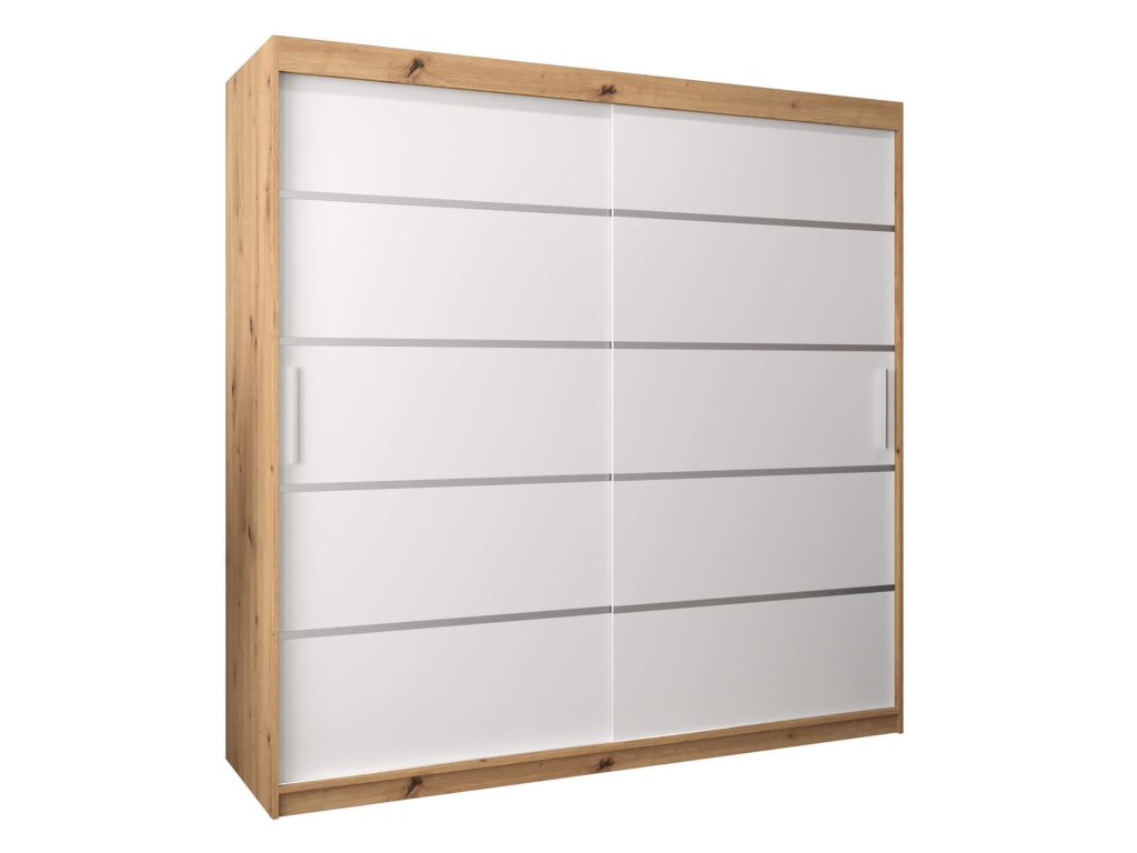 Praktická a priestranná šatníková skriňa Alyxia 180/200 v dvojfarebnej kombinácii (dub artisan / biela) Vám ponúkne dostatok úložného priestoru na Vaše oblečenie. Skriňa je vyrobená z vysoko kvalitnej laminovanej dosky (DTD) o hrúbke 16 mm, ktorá je odolná voči poškriabaniu, vlhkosti a vysokej teplote. Hrany skrine sú upravené kvalitnou PVC dyhou. Použitý je posúvný systém ,,BIMAK“ a hliníkové vodidlá, ktoré Vám zaručia pohodlné otváranie a zatváranie dverí. Vnútro skrine je rozčlenené na tri časti. Po stranách je tvorená štyrmi policami, ktoré vytvoria päť praktických úložných priestorov a v strede sa nachádza jedna polička a dve vešiakové tyče. Moderná skriňa vhodná do spálne, chodby či predsiene.
