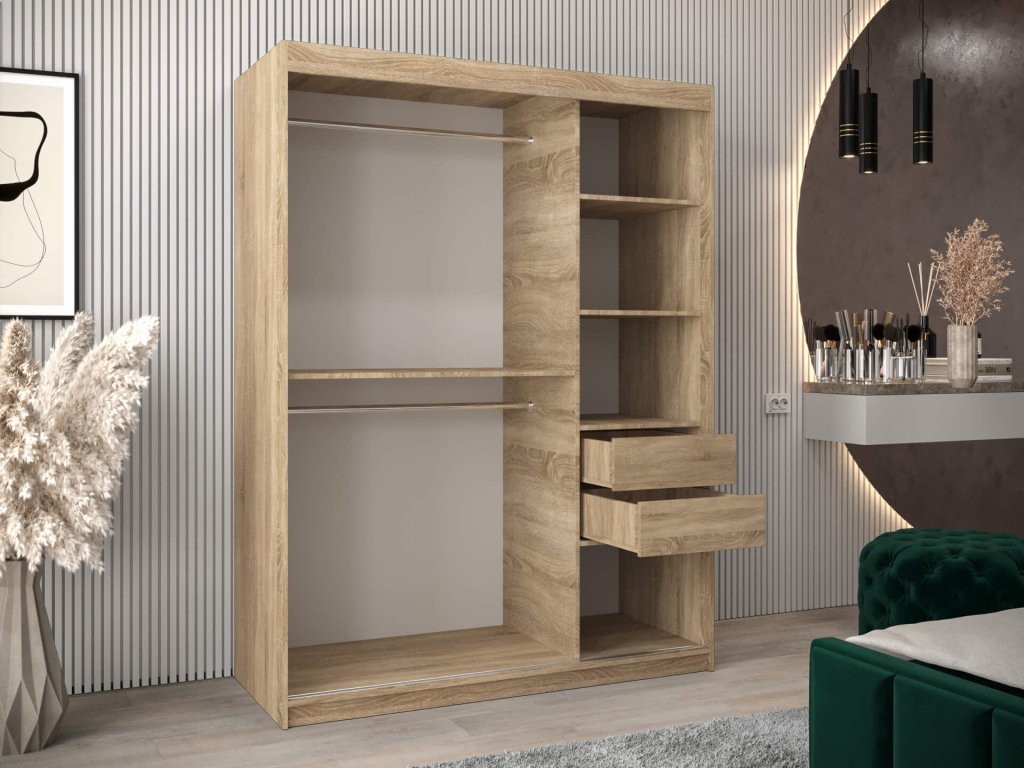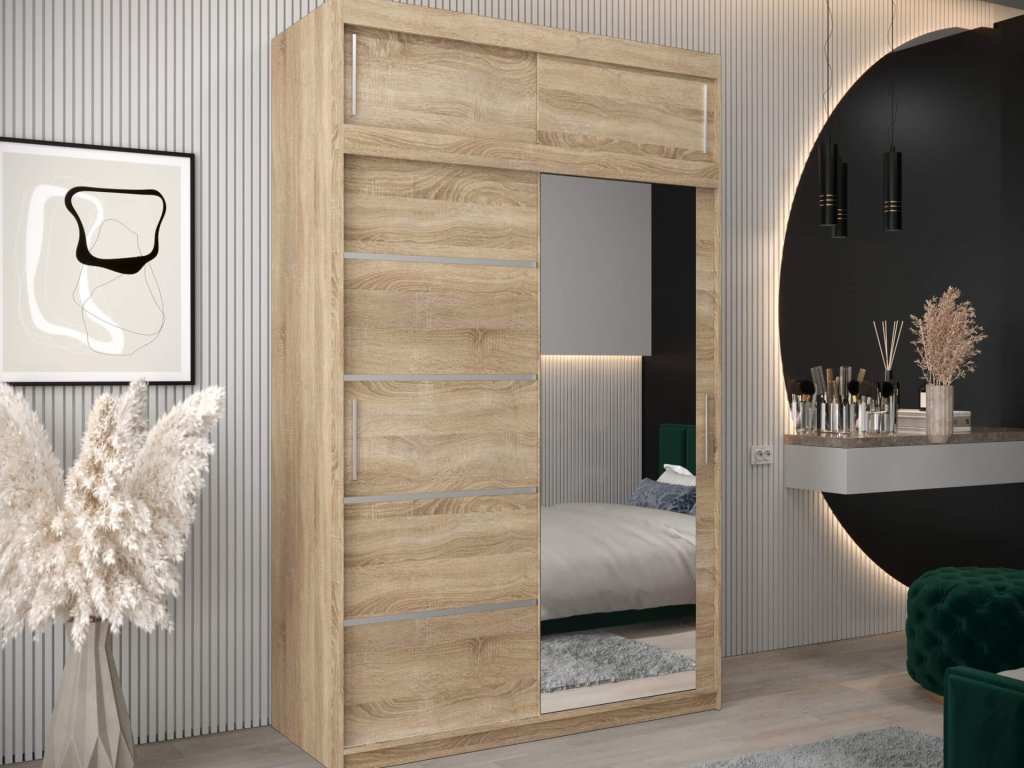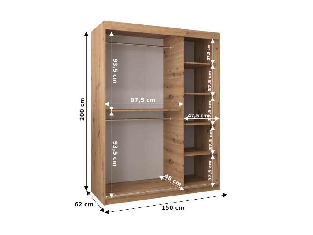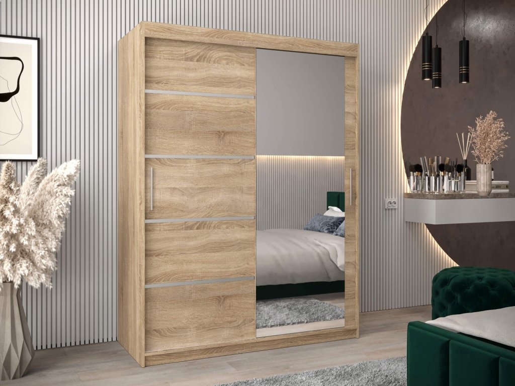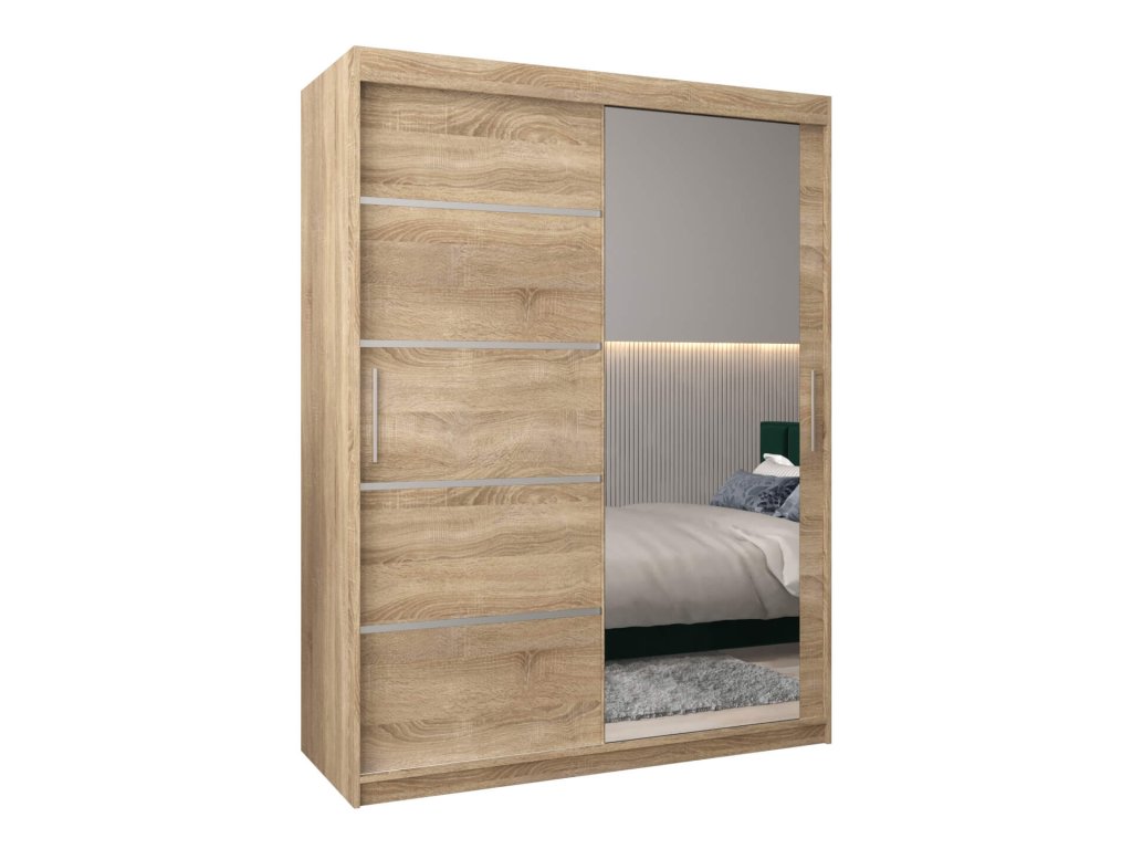 Praktická šatníková skriňa so zrkadlom Alyxia II 150 v nadčasovej farbe dub sonoma. Skriňa je vyrobená z vysoko kvalitnej laminovanej dosky (DTD) o hrúbke 16 mm, ktorá je odolná voči poškriabaniu, vlhkosti a vysokej teplote. Hrany skrine sú upravené kvalitnou PVC dyhou. Použitý je posúvný systém ,,BIMAK“ a hliníkové vodidlá, ktoré Vám zaručia pohodlné otváranie a zatváranie dverí. Vnútro skrine je rozčlenené na dve časti. Pravá strana je tvorená štyrmi policami, ktoré vytvoria päť praktických úložných priestorov a na ľavej strane sa nachádza jedna polička a dve vešiakové tyče. Moderná skriňa vhodná do spálne, chodby či predsiene.