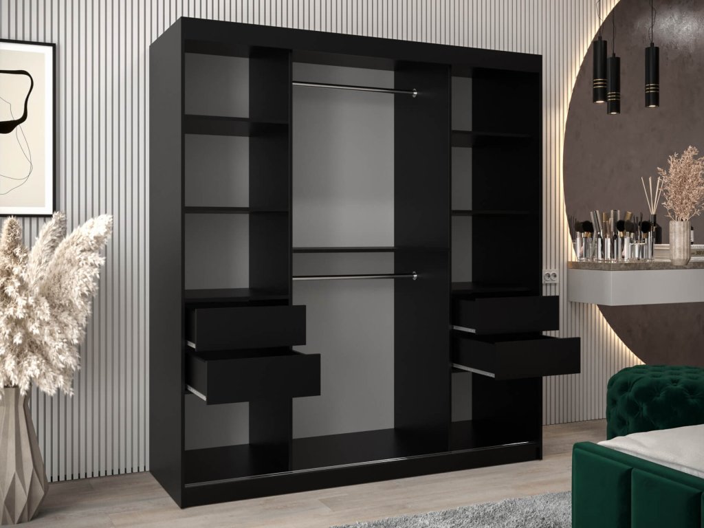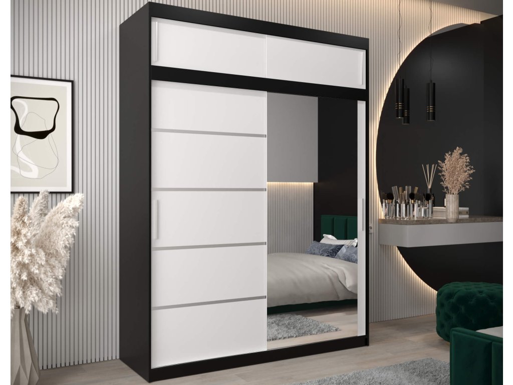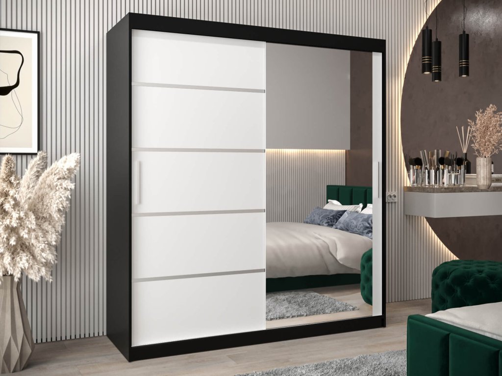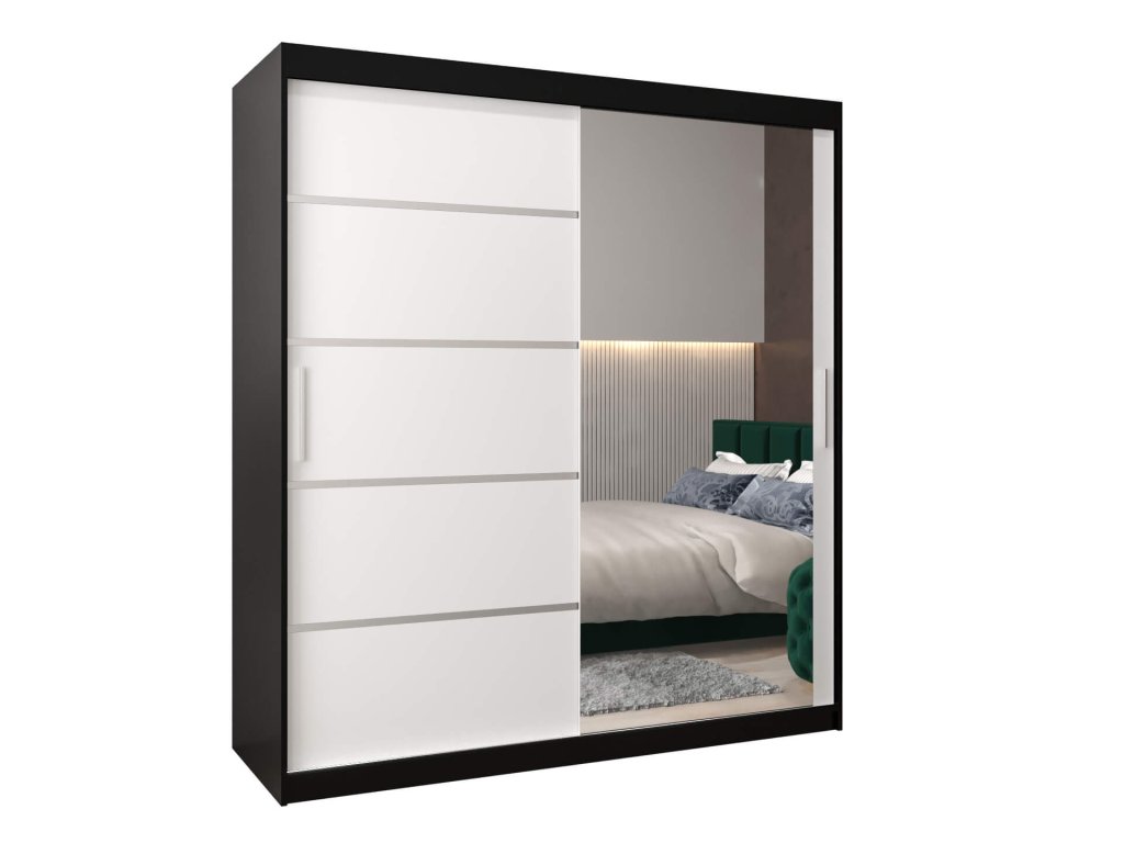 Čierno-biela šatníková skriňa so zrkadlom Alyxia II 180/200 Vám ponúkne dostatok úložného priestoru na Vaše oblečenie. Skriňa je vyrobená z vysoko kvalitnej laminovanej dosky (DTD) o hrúbke 16 mm, ktorá je odolná voči poškriabaniu, vlhkosti a vysokej teplote. Hrany skrine sú upravené kvalitnou PVC dyhou. Použitý je posúvný systém ,,BIMAK“ a hliníkové vodidlá, ktoré Vám zaručia pohodlné otváranie a zatváranie dverí. Vnútro skrine je rozčlenené na tri časti. Po stranách je tvorená štyrmi policami, ktoré vytvoria päť praktických úložných priestorov a v strede sa nachádza jedna polička a dve vešiakové tyče. Moderná skriňa vhodná do spálne, chodby či predsiene.