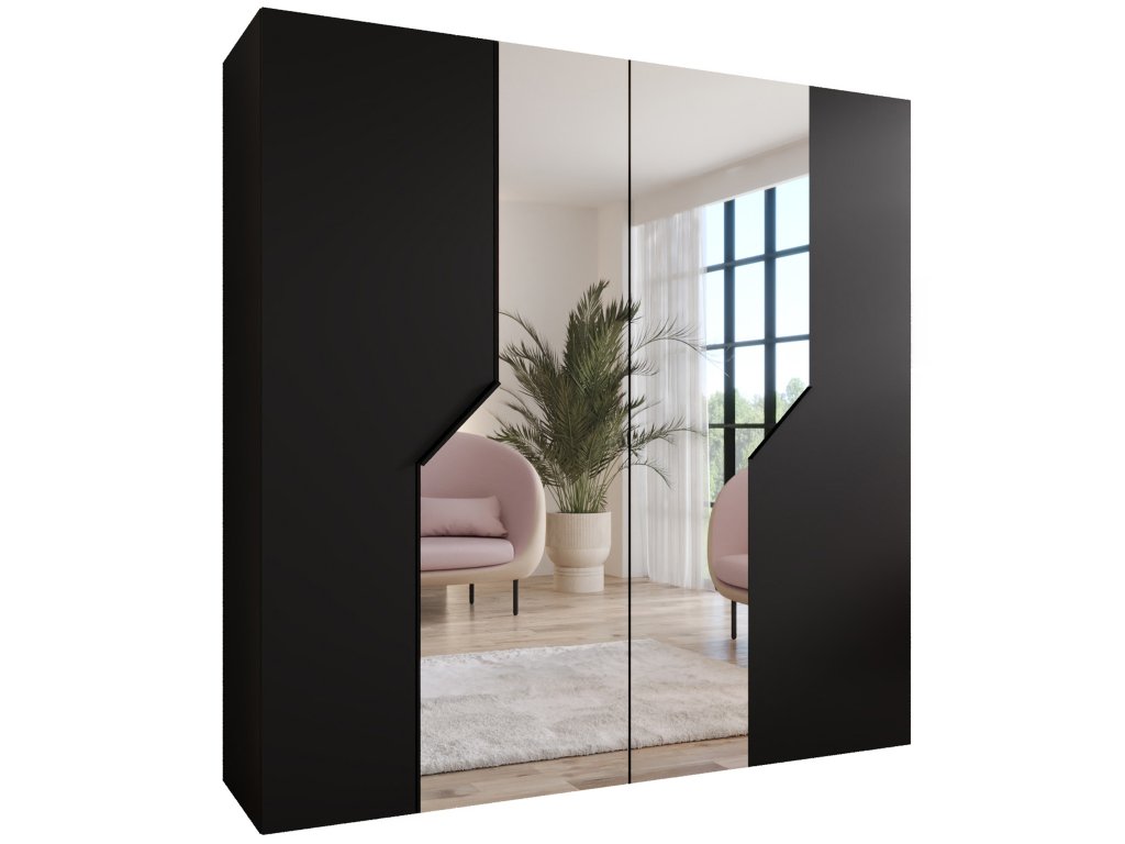 Priestranná čierna šatníková skriňa Andrew 2 upúta pozornosť svojím moderným a nadčasovým vzhľadom. Stredná časť je vybavená veľkým lešteným zrkadlom, ktoré opticky zväčšuje priestor a dodáva skrini sofistikovaný charakter. Minimalistické línie dopĺňajú diagonálne čierne úchytky, ktoré zvýrazňujú elegantný dizajn, a CNC frézované čelá podčiarkujú precízne spracovanie. Tmavé prevedenie pôsobí štýlovo a ľahko sa kombinuje s modernými aj klasickými interiérmi – ideálne do spální, obývacích izieb či chodieb.