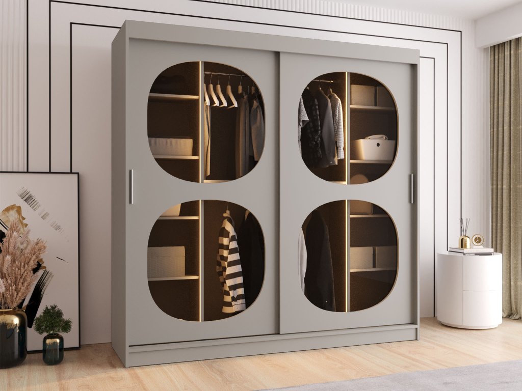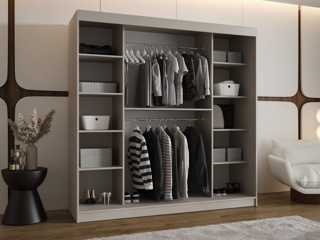 Vnútorné usporiadanie tejto šatníkovej skrine s posúvnymi dverami je premyslené do posledného detailu. Stredná časť obsahuje dve kovové tyče na zavesenie oblečenia a jednu policu, vhodnú na doplnky či obuv. Po oboch stranách sa nachádza osem priestranných políc, ktoré ponúkajú dostatok miesta na zložené odevy, posteľnú bielizeň alebo úložné boxy. Kvalitný posuvný systém BIMAK s hliníkovými lištami zaisťuje tichý a plynulý chod dverí. Hrany skrine sú ošetrené PVC dyhou, čo zvyšuje odolnosť voči poškodeniu a predlžuje jej životnosť.