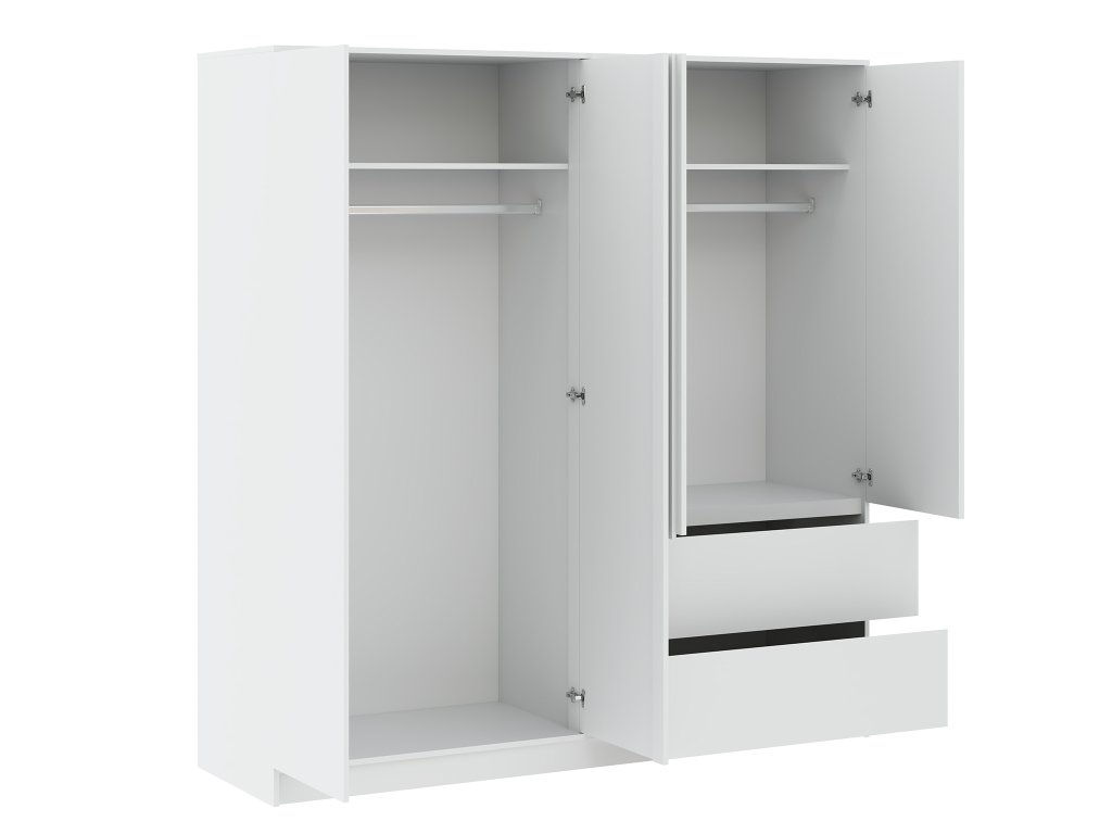 Šatníková skriňa Basit 4D2S je dokonalým spojením funkčnosti a moderného dizajnu. Vyrobená z kvalitnej bielej laminátovej dosky, ponúka praktické riešenie úložného priestoru. Na jednej strane sa nachádzajú dvojdvere s vešiakovou tyčou a praktickou policou, ideálne pre organizáciu vášho oblečenia. Na druhej strane sú takisto dvojdvere, pod ktorými sa nachádzajú dva priestranné šuflíky, ktoré poskytujú dostatok miesta na ukladanie bytového textilu a iných drobností. S minimalistickým vzhľadom a elegantným otváraním cez frézovanú hranu sa skriňa Basit 4D2S bez problémov integruje do každého moderného interiéru, pričom zabezpečuje maximálny komfort a prehľadnosť vo vašich veciach.