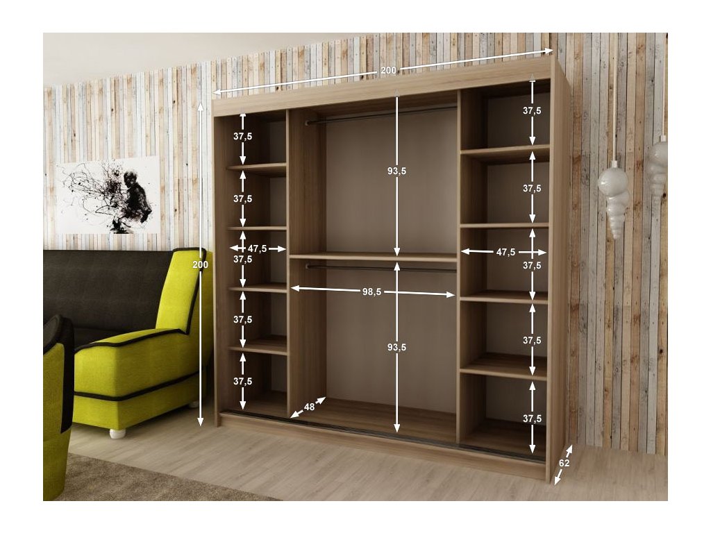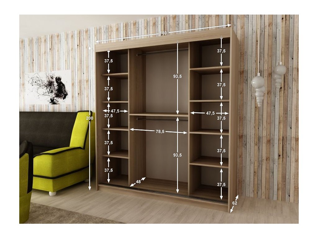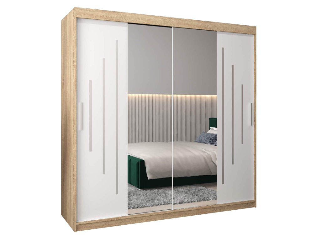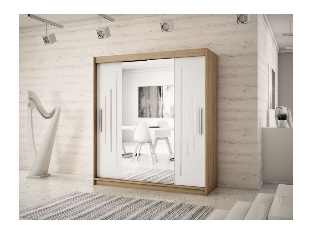 Skriňa v originalnom prevedeni so zrkadlom Bethany je vyrobená z nábytkovej dosky, ktorej hrany sú upravené kvalitnou PVC dyhou. Vďaka posúvnému systému ,,BIMAK“ a hliníkovým vodidlám sa zaručí pohodlné otváranie a zatváranie posuvných dverí. Vnútorné rozloženie je členené na 3 časti. Po stranách sa nachádzajú praktické poličky, štyri na ľavej a štyri na pravej strane, ktoré poskytnú dostatok úložného priestoru. V strede je jedna polica a dve vešiakové tyče, ktoré sú súčasťou skrine. Priestranná skriňa je vhodná do modernej spálne a predsiene.