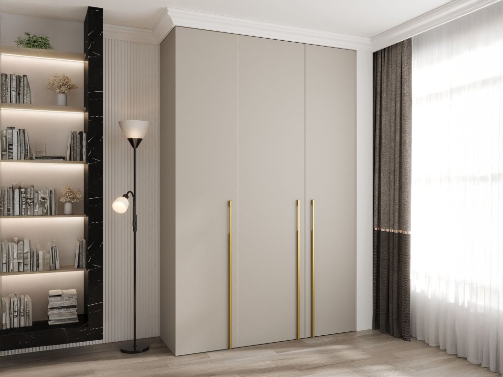 Skriňa v kašmírovej farbe zaujme čistou líniou a zlatými úchytkami umiestnenými decentne v spodnej časti dverí – jemný detail s nádychom luxusu. Korpus je vyrobený z pevnej laminovanej dosky s hrúbkou 16 mm, ktorá zaručuje odolnosť aj pri každodennom používaní. Hrany sú zabezpečené 0,5 mm PVC dyhou, ktorá chráni pred opotrebovaním. Stabilitu skrine posilňuje zadná časť z kvalitnej HDF dosky, čo z nej robí spoľahlivý a trvácny kúsok do každého interiéru. Interiér skrine Como 3 ponúka pevnú kovovú tyč na zavesenie odevov a prakticky rozmiestnené pevné police. Výklopné dvere s tichým dovieraním Hettich zaručia komfortné každodenné používanie.