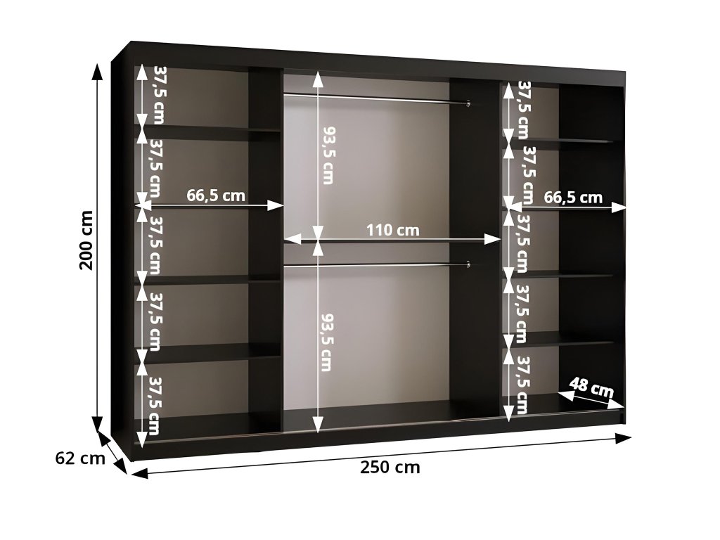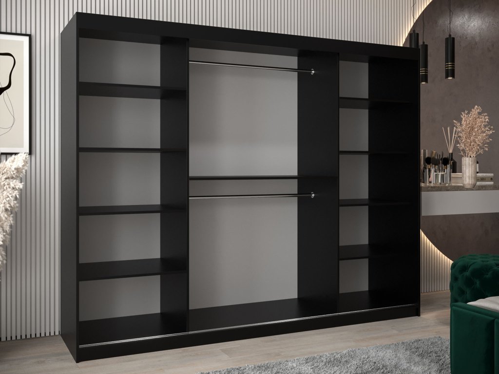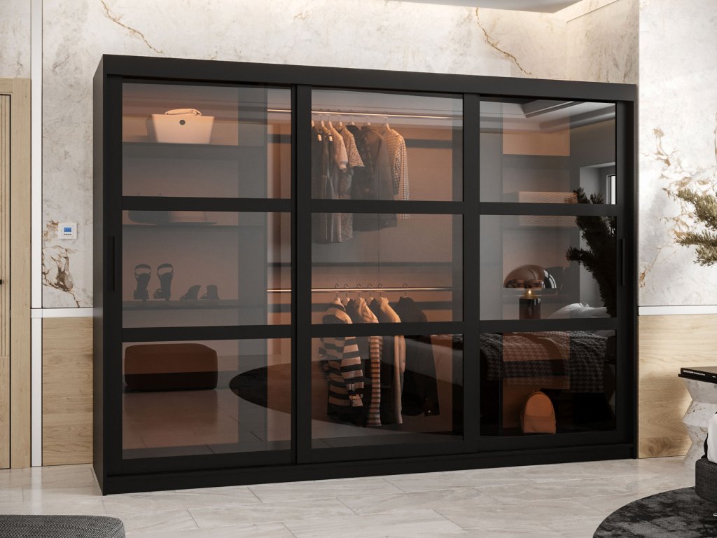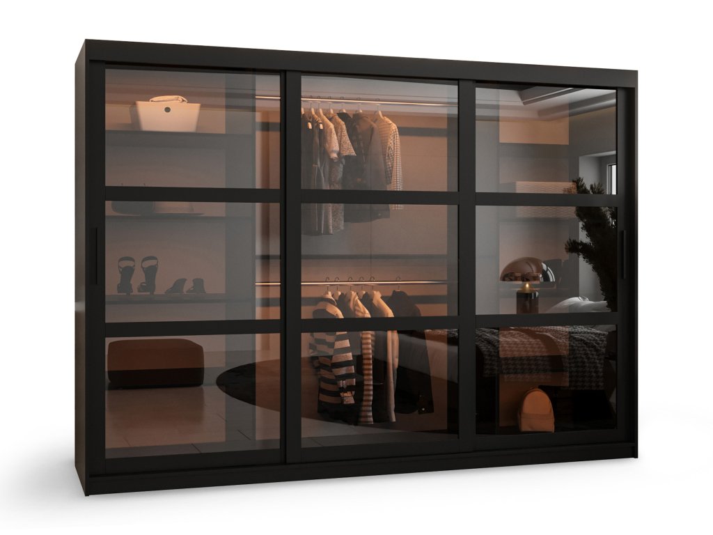 Šatníková skriňa Dome v elegantnej čiernej farbe s impozantnou šírkou až 250 cm je dokonalým riešením pre tých, ktorí potrebujú štýlový a priestranný úložný priestor. Posuvné dvere s modernými presklenými panelmi a čiernymi drevenými lištami jej dodávajú sofistikovaný vzhľad, zatiaľ čo čierne úchyty podčiarkujú jej moderný charakter.