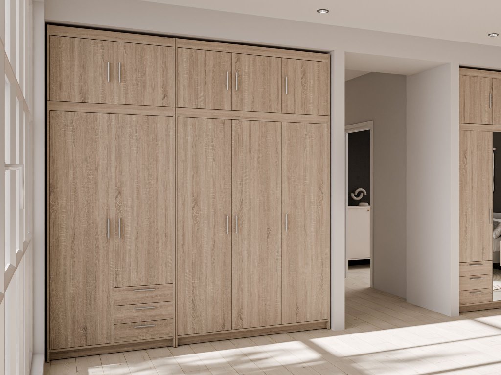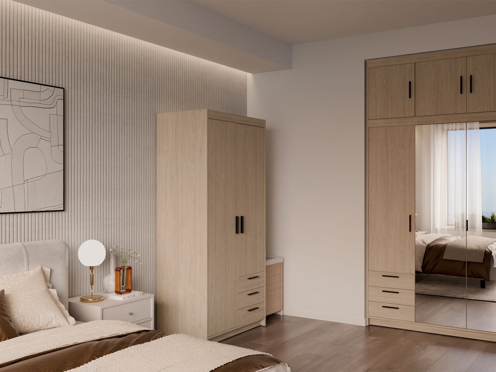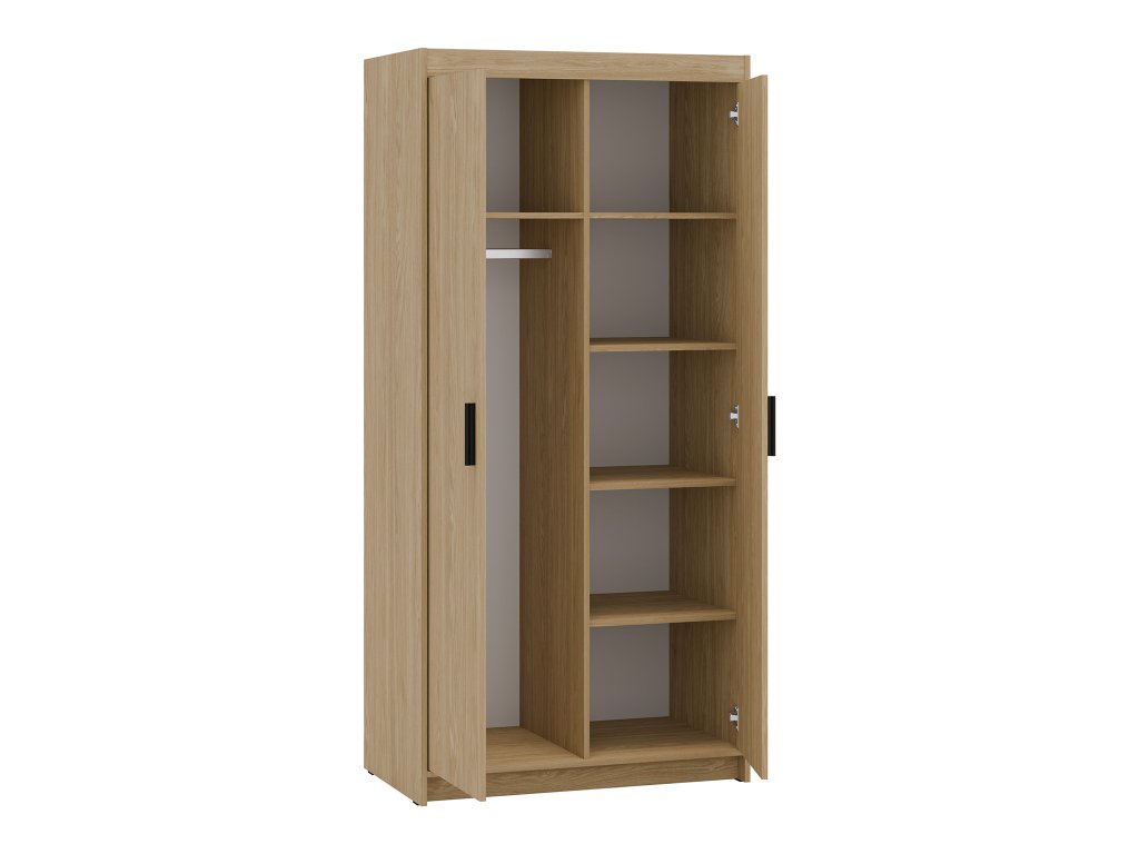 Vnútorné usporiadanie skrine je navrhnuté s dôrazom na funkčnosť a pohodlie. Kombinácia políc a šatníkovej tyče umožňuje prehľadné uloženie zloženého aj zaveseného oblečenia, obuvi či doplnkov. Kvalitná laminovaná doska je odolná voči poškriabaniu a vlhkosti, zatiaľ čo melamínové hrany zaručujú dlhú životnosť a estetický vzhľad aj pri každodennom používaní.