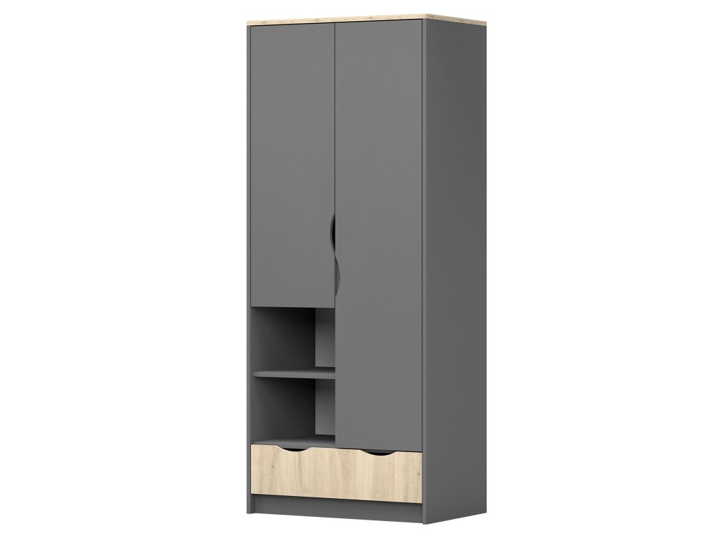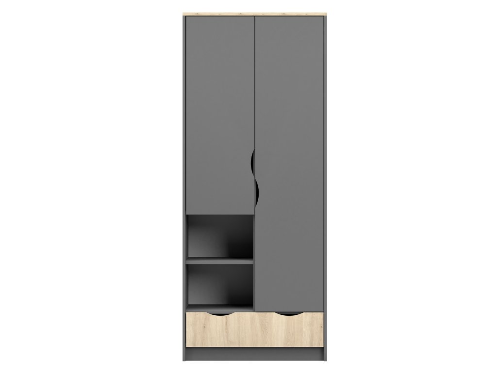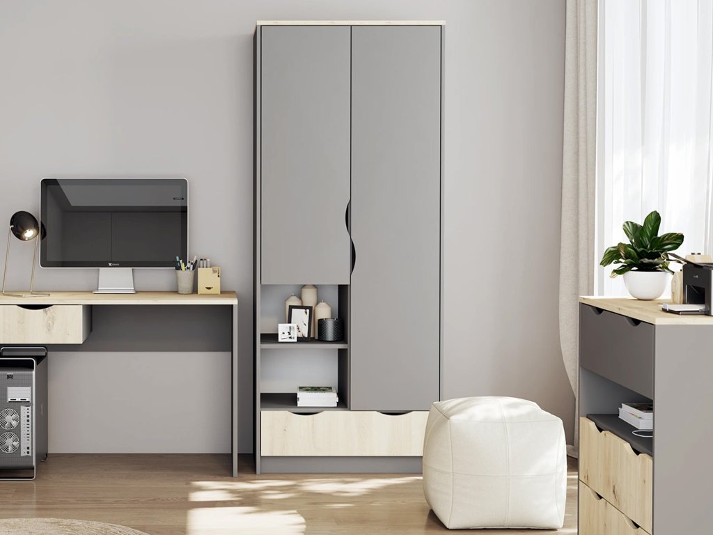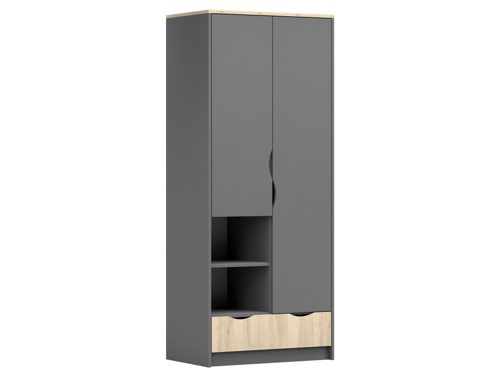 Dvojdverová šatníková skriňa Joy 2D v sivom prevedení s dekorom dub artisan je štýlovým a praktickým riešením pre detské alebo študentské izby. Vnútorný priestor je rozdelený na vešiakovú časť a niekoľko políc, čo zabezpečuje prehľadné uskladnenie oblečenia aj doplnkov. Skriňa je navrhnutá s dôrazom na jednoduchosť – bezúchytkový systém zaručuje hladké otváranie a zároveň pôsobí elegantne a moderne. Nízky podstavec dodáva nábytku stabilitu a celkový čistý vzhľad. Sivý odtieň v kombinácii s dubom artisan vytvára vyvážený kontrast, ktorý pôsobí nadčasovo a zároveň útulne.