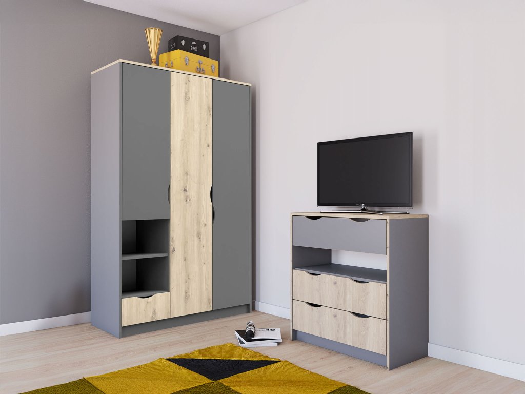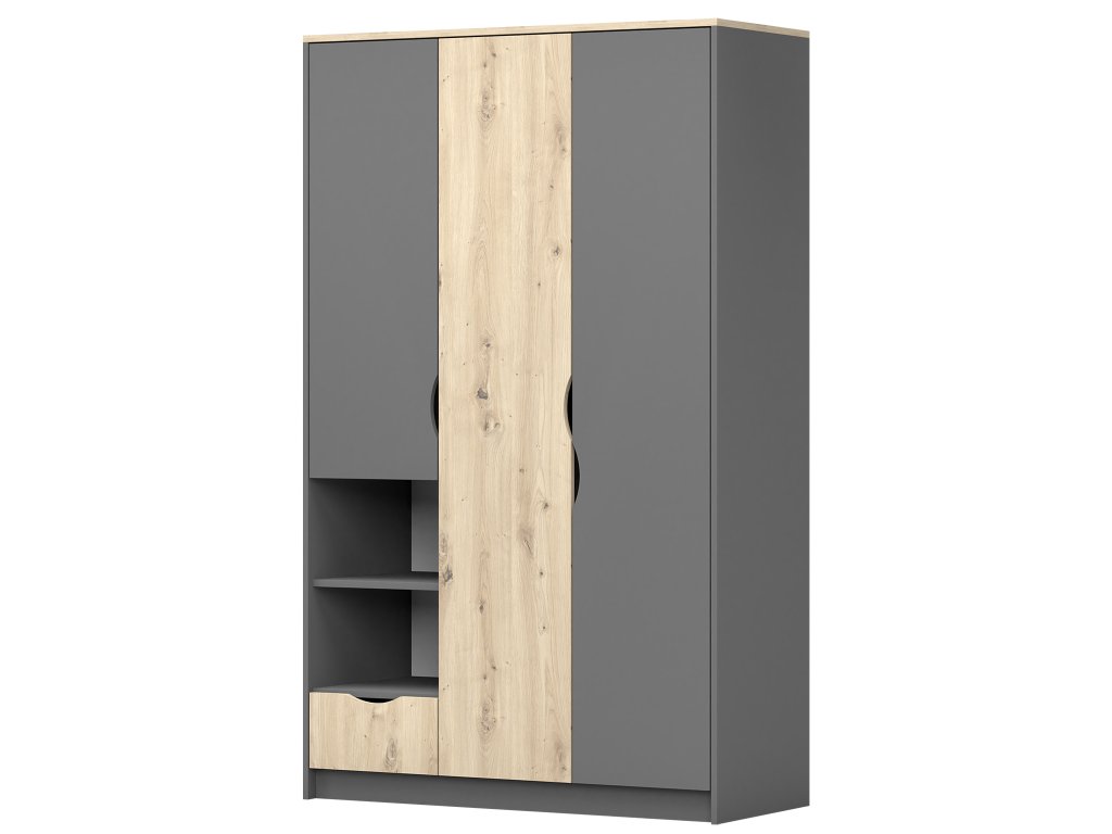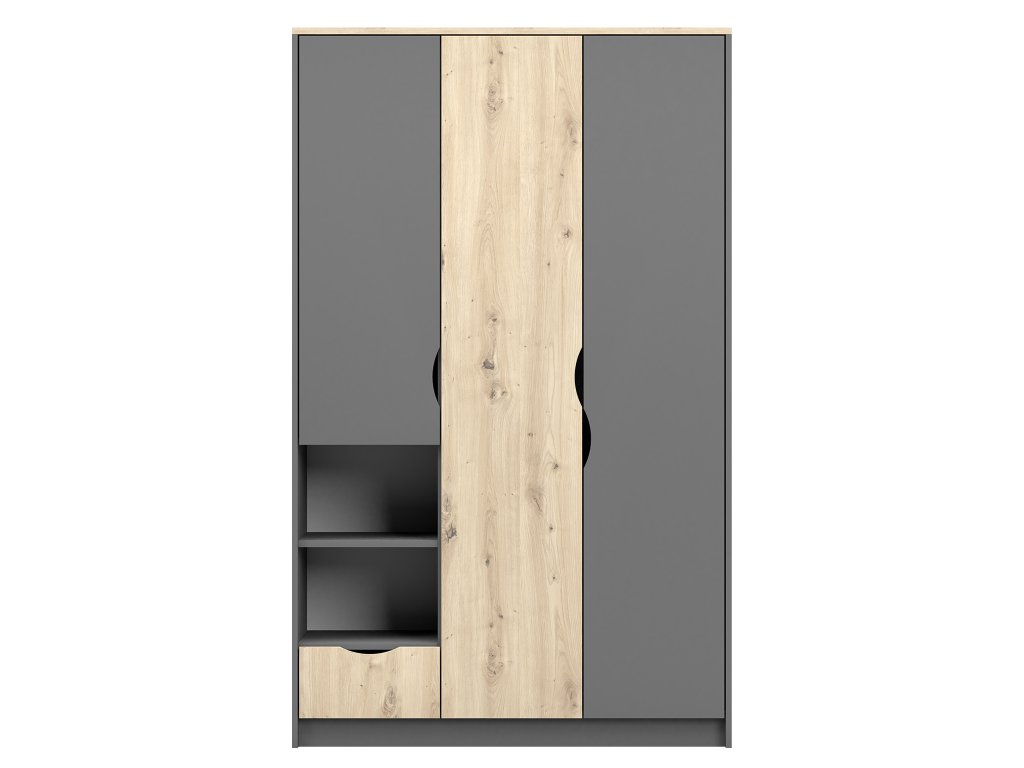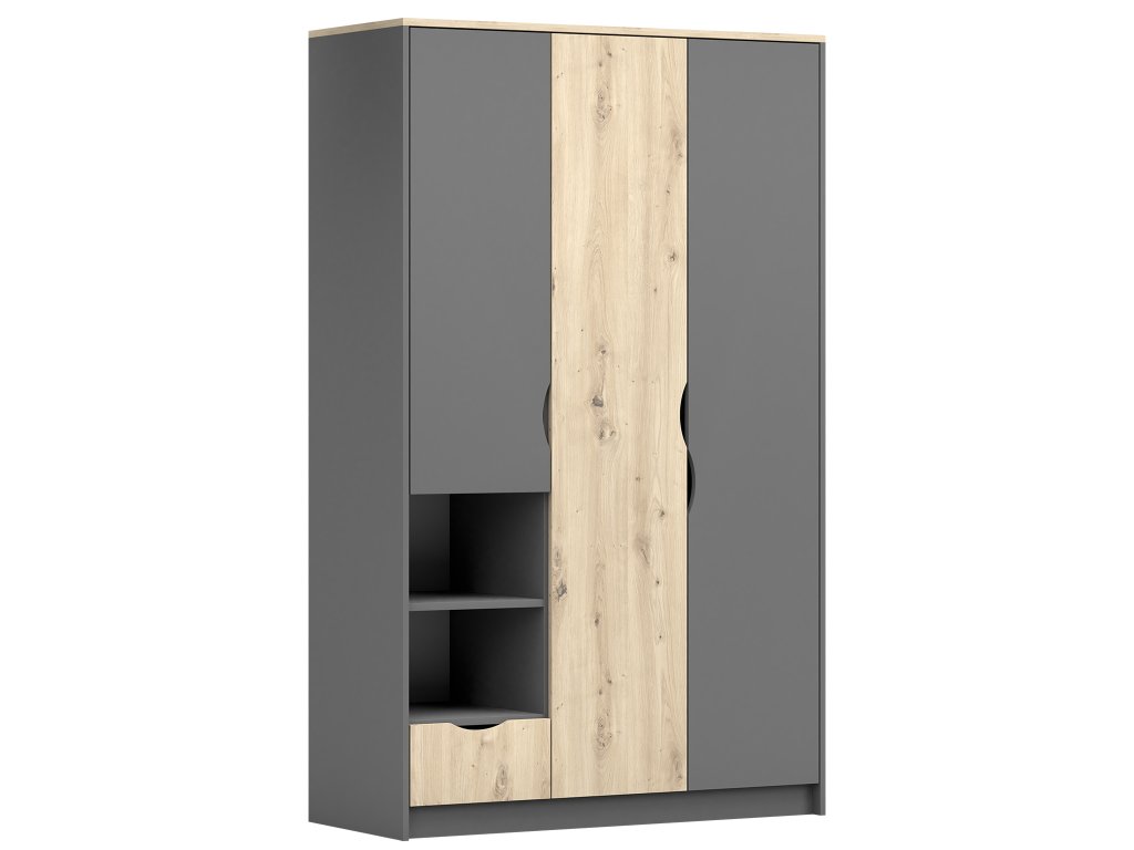 Šatníková skriňa s trojdverovom prevedení Joy 3D v štýlovom spojení sivej farby a dubu artisan je praktickým doplnkom do detskej či študentskej izby. Ponúka množstvo úložného priestoru, ktorý je rozdelený medzi vešiakovú tyč a niekoľko hlbokých políc – ideálne na prehľadné usporiadanie oblečenia, školských potrieb aj doplnkov. Bezúchytkové otváranie jej dodáva čistý, moderný vzhľad a zároveň zvyšuje pohodlie pri používaní. Stabilná konštrukcia na podstavci zaručuje pevnosť a jednoduchšiu údržbu priestoru pod skriňou.