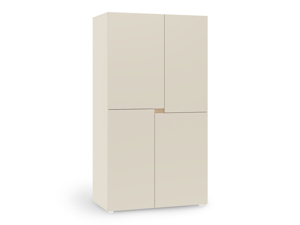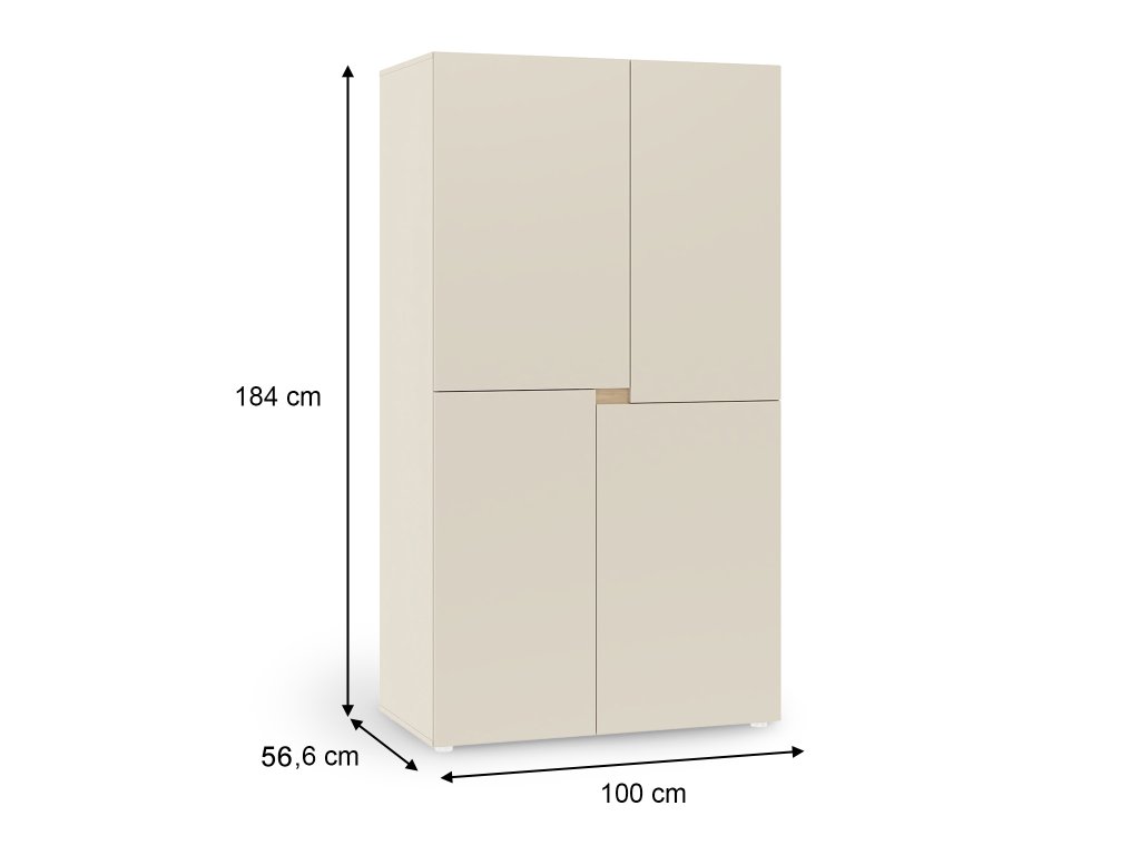 Šatníková skriňa z kolekcie Lens prinesie do detskej či študentskej izby vášho dieťaťa poriadok a eleganciu v jednom. Má Jemný kašmírový odtieň. Čím nebudete mať problém zladiť skriňu s iným nábytkom. Skriňa je vyrobená z odolnej 16 mm laminovanej drevotriesky, ktorá v kombinácii s viditeľnými ABS hranami zaručuje dlhú životnosť a odolnosť voči každodennému používaniu. Zadná strana nie je olepená hranou. Praktické 4 dvierka so štandardnými pántami poskytujú jednoduchý prístup k uloženým veciam a otvárajú sa cez decentný otvor medzi čelami, vďaka čomu skriňa pôsobí minimalisticky a bez rušivých úchytiek. Vo vnútri sa nachádzajú tri funkčné police, ktoré zabezpečia dostatok priestoru na uloženie oblečenia, posteľnej bielizne či iných doplnkov. Celý dizajn dopĺňajú okrúhle strieborné plastové nožičky, ktoré zabezpečujú stabilitu.