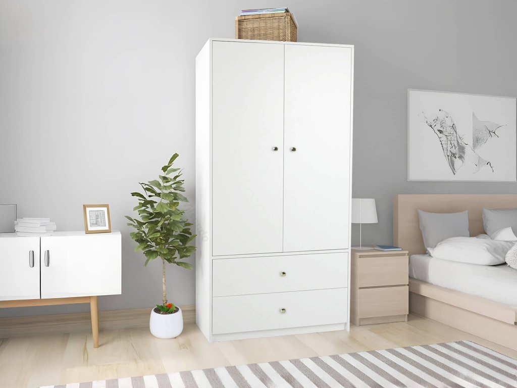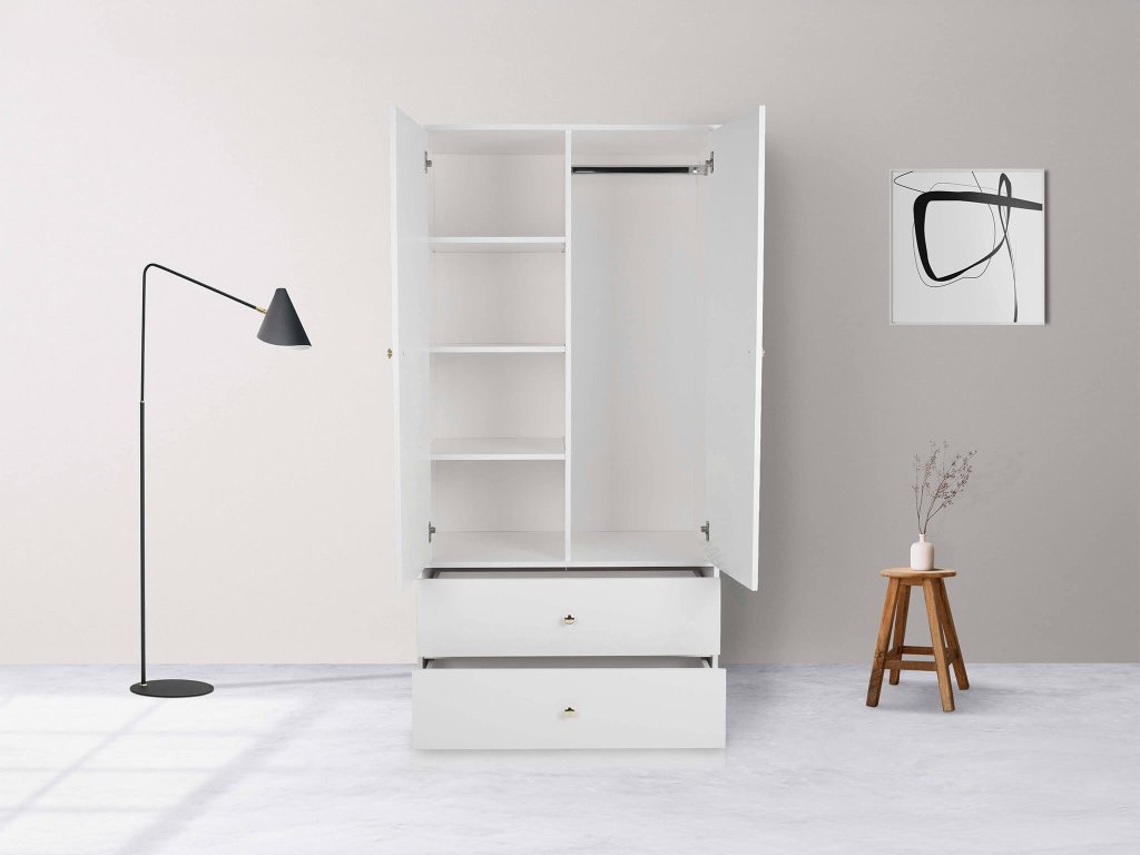 Dvojdverová biela šatníková skriňa Leo L2 s elegantnými zlatými úchytkami. Neutrálna skriňa je skvelá do spálne, detskej izby alebo predsiene. Je vyrobená z odolnej drevotrieskovej dosky KRONO. Biely matný povrch s lesklými zlatými úchytmi vnesú eleganciu a ľahkosť do vášho interiéru. Uložte si oblečenie a obuv v priestrannej skrini. Skriňa je rozdelená do dvoch častí, kde jedna časť obsahuje 3 praktické police na uloženie poskladaného oblečenia. Druhá strana disponuje vešiakovou tyčou pre zavesenie vašich šiat a kabátov. Naša vešiaková tyč je pevná a kvalitná čo garantuje bezpečné zavesenie aj najťažších kúskov. Dve zásuvky v spodnej časti skrine umožňujú ľahký prístup k drobným predmetom alebo textíliám. Otváranie skrine je riešené štýlovými zlatými úchytkami. Zadná strana je vyrobená zo sololitu a upevnená pomocou inovatívnych šróbikov, čo zaručuje maximálnu stabilitu a odolnosť. Skriňa s výškou 180 cm a šírkou 90 cm ponúka dostatok úložného priestoru bez toho, aby zaberala príliš veľa miesta vo vašej miestnosti. Navyše je vybavená kvalitnými ABS hranami, čo dodáva celkovému dizajnu eleganciu.