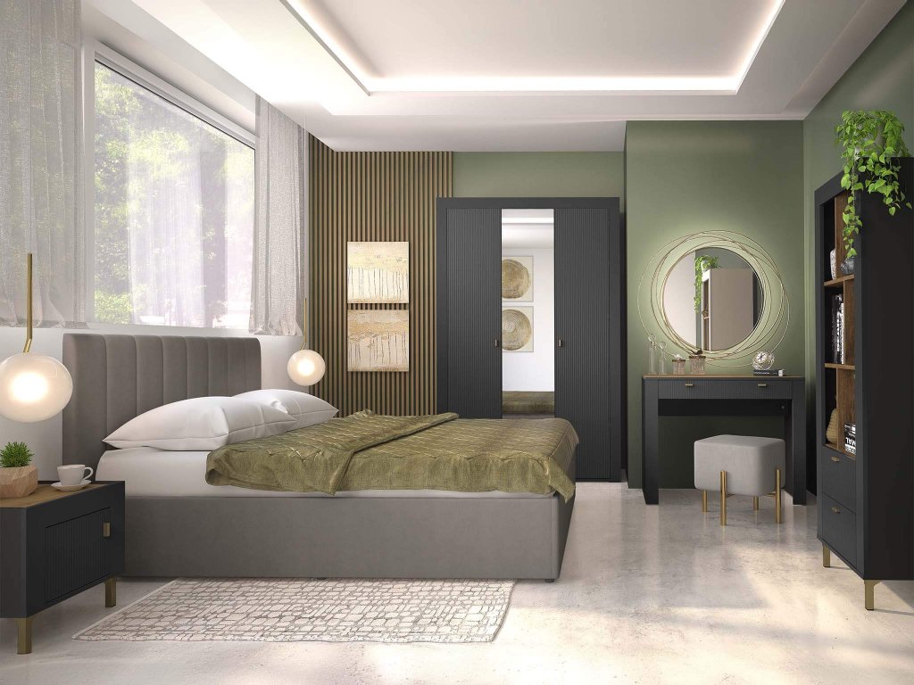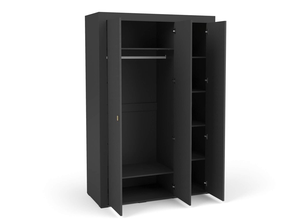 Hľadáte štýlovú šatníkovú skriňu, ktorá dodá vášmu interiéru moderný vzhľad? Šatníková skriňa Mossa v elegantnej čiernej farbe je tou správnou voľbou. Jej jedinečný vrúbkovaný povrch okamžite upúta pozornosť a dodá vašej spálni či šatníku nádych sofistikovanosti. Táto trojdverová skriňa s klasickým otváraním je vybavená praktickým zrkadlom na stredných dverách, ktoré nielenže zväčší optický priestor, ale zároveň vám umožní pohodlne skontrolovať váš outfit. Skriňa stojí na ôsmych nízkoprofilových nožičkách, ktoré zabezpečujú stabilitu a dodávajú jej moderný, nadýchaný vzhľad.