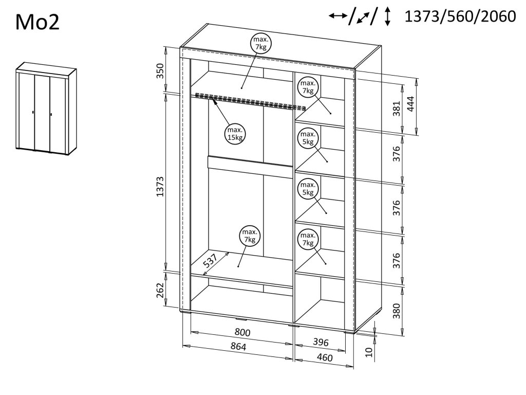 Interiér skrine Mossa je navrhnutý tak, aby poskytoval maximálnu úložnú kapacitu. V ľavej časti nájdete dve police s nosnosťou 7 kg a vešiakovú tyč s nosnosťou až 15 kg, ktorá je ideálna pre zavesenie vašich najlepších kúskov. Pravá časť skrine obsahuje štyri police, kde horná a dolná unesú 7 kg, zatiaľ čo stredné police majú nosnosť 5 kg. Tento priestor je ideálny na prehľadné uloženie vášho oblečenia, doplnkov a ďalších osobných vecí. Šatníková skriňa Mossa je perfektnou voľbou pre každého, kto hľadá spojenie moderného dizajnu a praktickej funkčnosti. Svojou eleganciou a inteligentným úložným priestorom vyhovuje aj tým najnáročnejším požiadavkám na organizáciu oblečenia. Vytvorte si prehľadný a harmonický priestor vo vašej spálni s touto štýlovou skriňou.