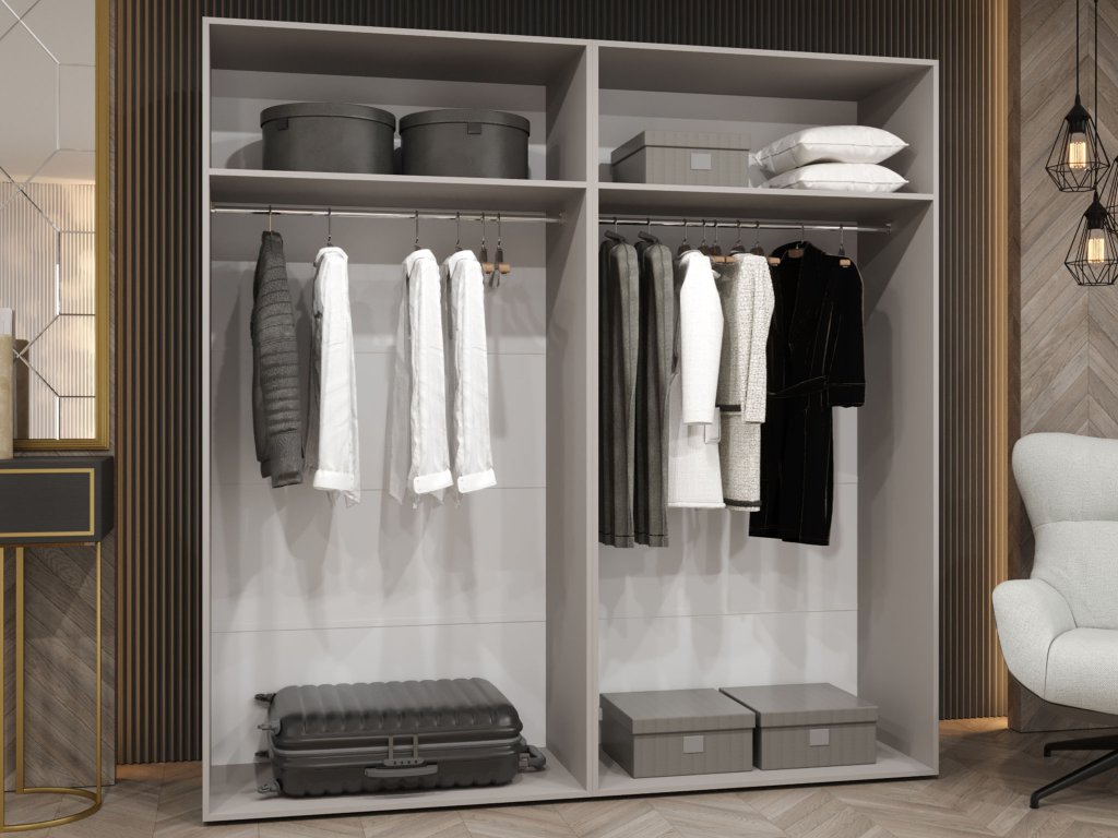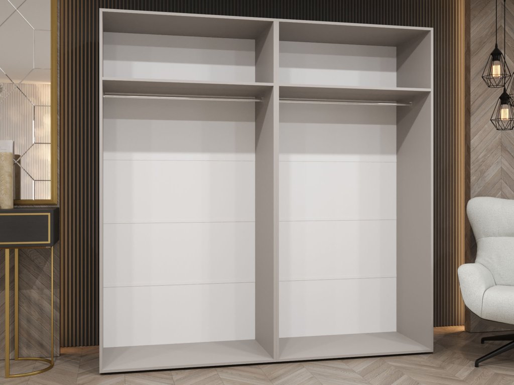Model skrine Pianos 1 bol navrhnutý tak, aby odolal skúške času, a to vďaka použitiu vysokokvalitnej 16 mm laminovanej nábytkovej dosky. Každý detail, od starostlivo spracovanej PVC hrany až po zadnú stranu z HDF dosky, je podriadený maximálnej odolnosti voči každodennému používaniu. Skriňa je vybavená moderným systémom tlmeného zatvárania, ktorý zabezpečuje, že sa aj široké krídla dverí dovierajú s absolútnou ľahkosťou a v úplnom tichu. Vnútorné vybavenie s kovovou šatníkovou tyčou a policami uchytenými cez excentrické spoje zaručuje stabilitu aj pri plnom zaťažení. Pre tých, ktorí vyžadujú maximálny poriadok, je tu navyše možnosť pridania extra políc, čím sa úložná kapacita 200 cm šírky využije do posledného milimetra presne podľa vašich potrieb.
