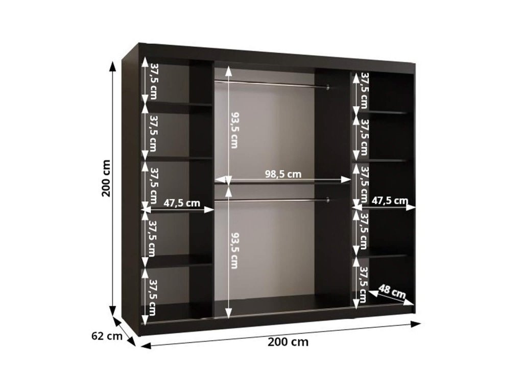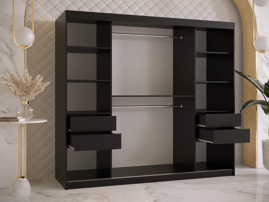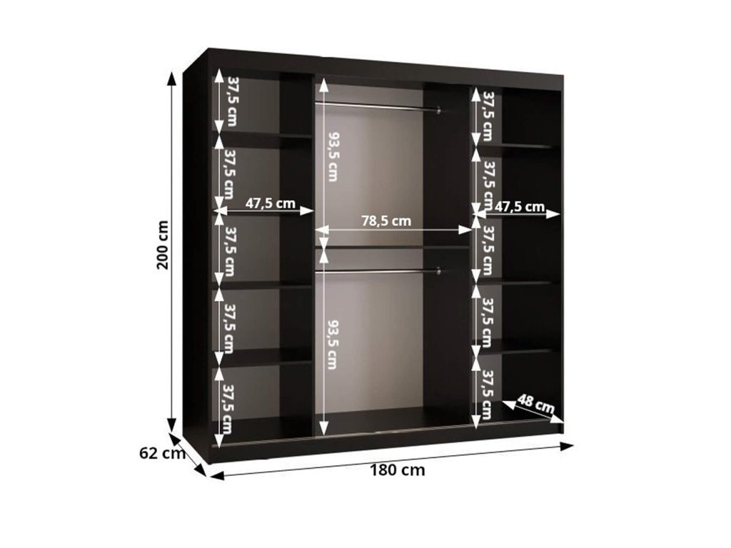 Vyberte si novú šatníkovú skriňu do vašej spálne, ktorá kombinuje štýl, praktickosť a kvalitu. Čierna šatníková skriňa Riflo Wave II 180/200 má moderné dizajnové prvky. Skriňa disponuje zásuvnými dverami, ktoré zabezpečujú plynulé a praktické otváranie a zatváranie. Hlavným prvkom tejto skrine je zrkadlo, ktoré dodáva priestoru väčšiu svetlosť. Kvalitné dizajnové frézy na povrchu dverí, pridávajú skrini eleganciu a šmrnc. S 2 vešiakovými tyčami a 4 poličkami poskytuje dostatok miesta na usporiadanie vašich odevov, obuvi a doplnkov. Hliníkové vodidlá a Bimak posuvný systém zaručujú plynulé a tiché otváranie skrine, čo je mimoriadne praktické. Na výrobu bola použitá DTD doska a čelá sú z MDF dosky, ktoré zabezpečujú pevnosť a odolnosť skrine, zatiaľ čo PVC rohy dodávajú ochranu a dlhú životnosť. Táto skriňa sa hodí do rôznych interiérových štýlov. Je vhodná pre modernejší dizajn, kde zvýrazní váš vkus a prinesie dotyk elegancie. S elegantnou čiernou farbou ju ľahko kombinujete s inými farbami a dekoráciami. Potrebujete skriňu pre váš osobný šatník, spálňu alebo šatník v hoteli, šatníková skriňa Riflo Wave II je ideálna. S jej kvalitnými materiálmi a nadčasovým dizajnom vám poskytne skvelú úložnú kapacitu a štýlový vzhľad. Ak hľadáte šatníkovú skriňu, ktorá spĺňa vaše požiadavky na kvalitu, dizajn a funkcionalitu, šatníková skriňa Riflo Wave II je správna voľba pre vás. Investujte do tejto skrine a získajte praktický a elegantný kúsok nábytku, ktorý prispieva k organizácii vášho šatníka a zároveň dodáva štýl do vášho interiéru.