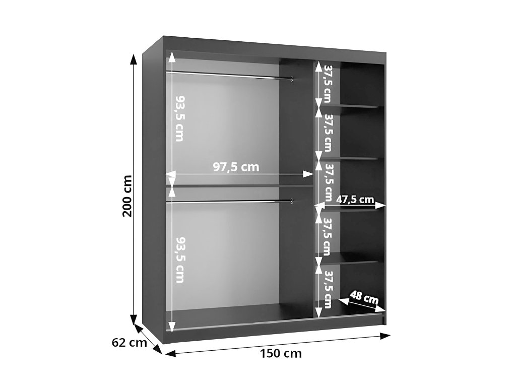 Rubino T disponuje prakticky členeným vnútrom, ktoré uľahčuje udržiavanie poriadku. Jedna časť skrine obsahuje police vhodné na uskladnenie bielizne, doplnkov alebo skladaného oblečenia. Druhá strana je vybavená dvomi kovovými tyčami a policou, ideálnou na zavesenie šiat, kabátov či košieľ. Vďaka tomuto premyslenému rozloženiu budete mať všetko vždy prehľadne na svojom mieste.