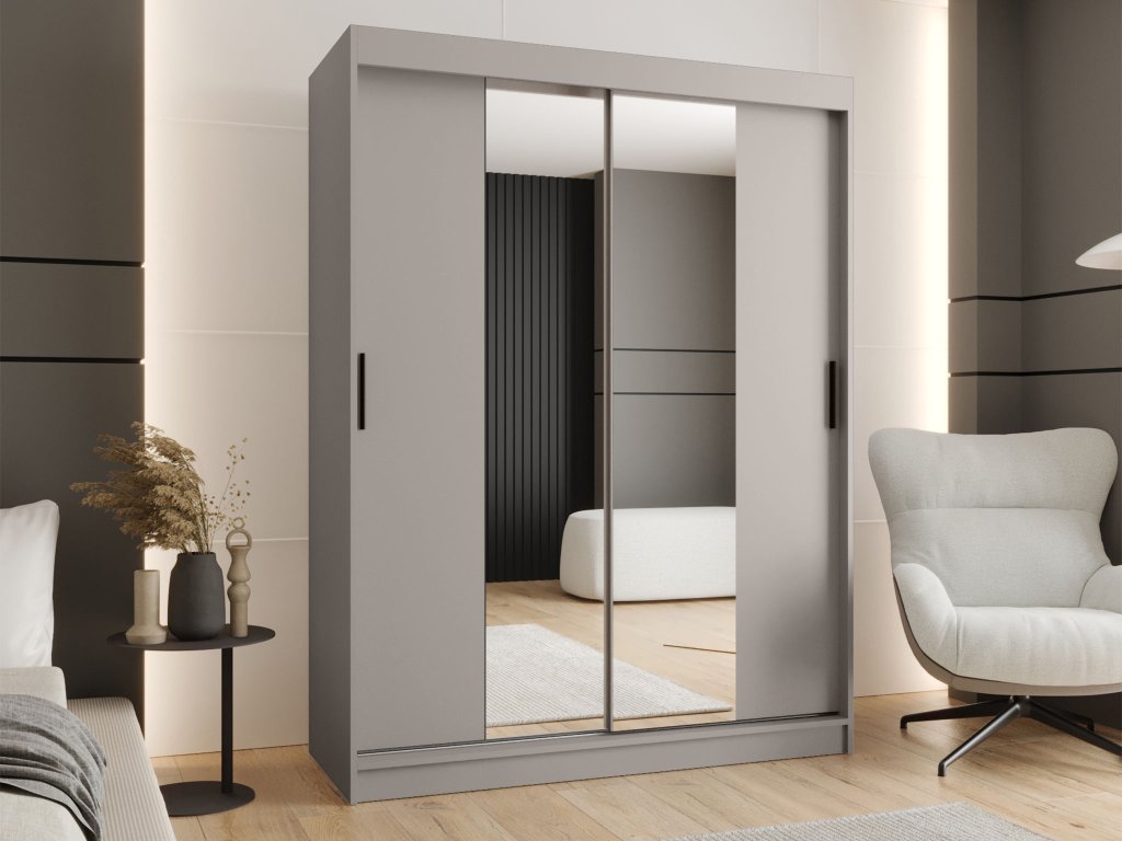 Moderná šatníková skriňa so zrkadlom Rubino T1 prinesie do vášho interiéru harmóniu a prehľad. Jej jemný kašmírový odtieň pôsobí nadčasovo a ľahko sa kombinuje s iným nábytkom. Zrkadlové dvere nielen opticky rozšíria priestor, ale zároveň pôsobia ako elegantný dizajnový prvok. Vďaka posuvnému systému LAGUNA sa dvere pohybujú ticho a bez námahy, čo zaručuje komfortné každodenné používanie. Pevnú konštrukciu zabezpečuje laminovaná doska s hrúbkou 16 mm, ktorá je odolná voči poškodeniu a jednoduchá na údržbu. Čierne plastové úchytky zvýrazňujú moderný charakter tejto dvojdverovej skrine, ktorá skvele zapadne do spálne, šatne či predsiene.